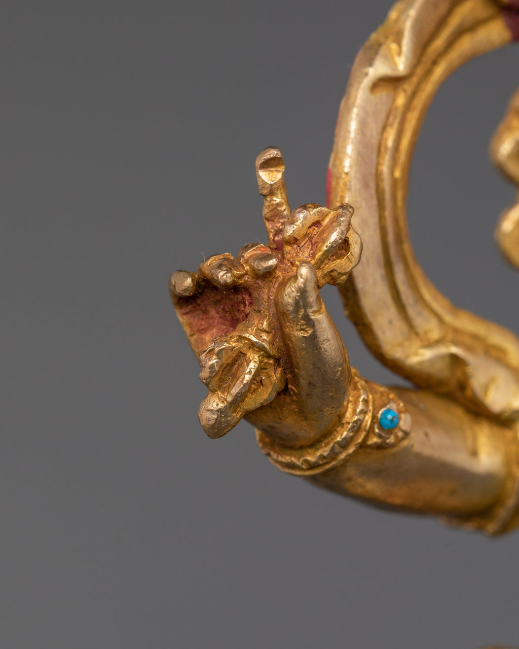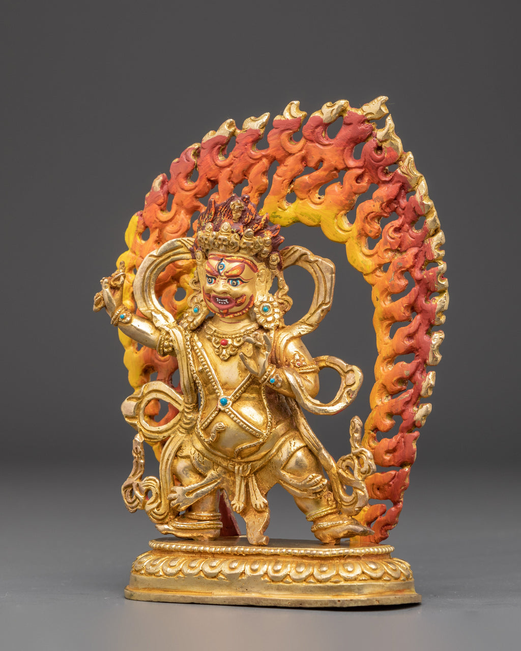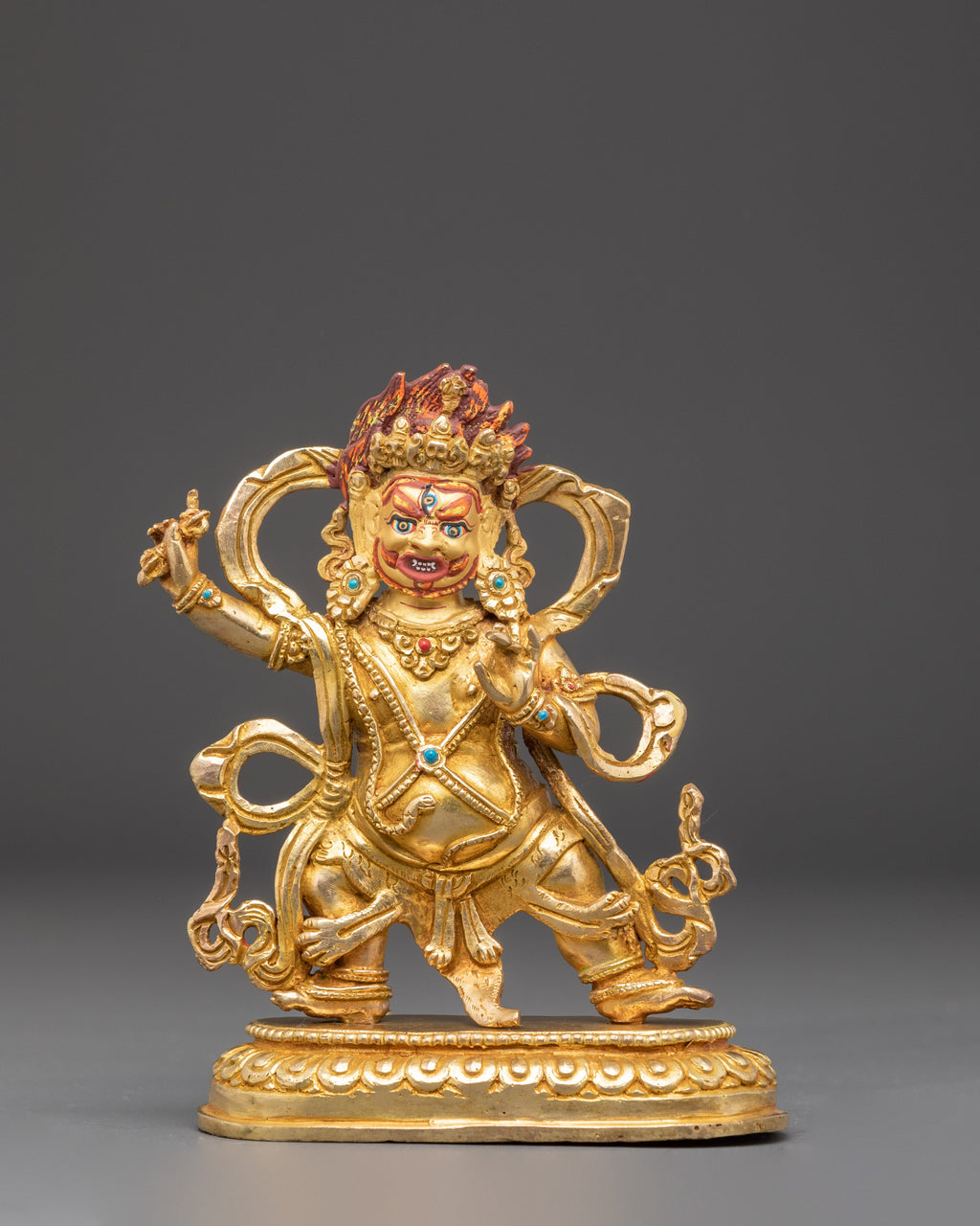 The Meditation Deity Vajrapani stands at 18.5cm in height and 13cm in width, weighing 0.81kg. Crafted from copper and gold-plated for a radiant finish, this powerful deity sculpture represents Vajrapani, the Buddhist protector and deity of strength, compassion, and spiritual protection. Known for his role in safeguarding Buddha's teachings, Vajrapani is often depicted in a fierce and protective stance, symbolizing the removal of obstacles and the nurturing of spiritual enlightenment. With vibrant artificial stones like turquoise and coral embedded into the sculpture, it offers both spiritual and aesthetic value to your altar or meditation space.