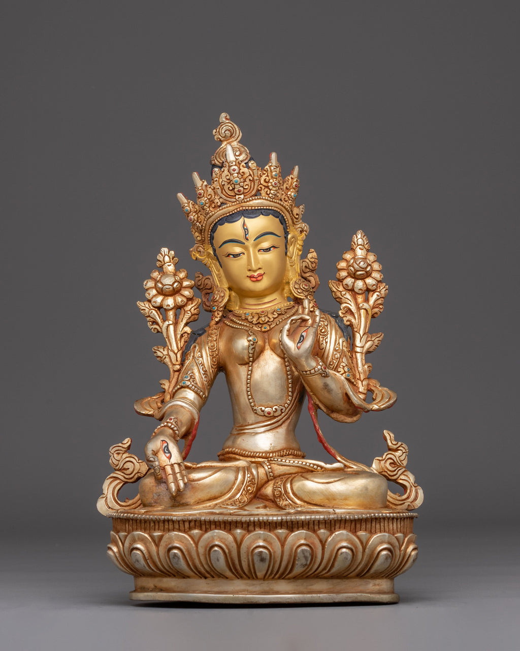 White Tara is adored in Tibetan Buddhism as the goddess of compassion and longevity, and she is frequently represented with seven eyes that watch over sentient creatures with loving awareness. She personifies the healing force of compassion and the wisdom of enlightenment. This stunning handcrafted statue exemplifies traditional Himalayan creativity, with each detail—from her delicate facial expression to the elaborate jewelry—telling a story of dedication and divine craftsmanship. The subtle shine of gold, as well as the colorful turquoise and coral accents, encourage spiritual introspection and provide a sense of serenity in meditation rooms and temples.