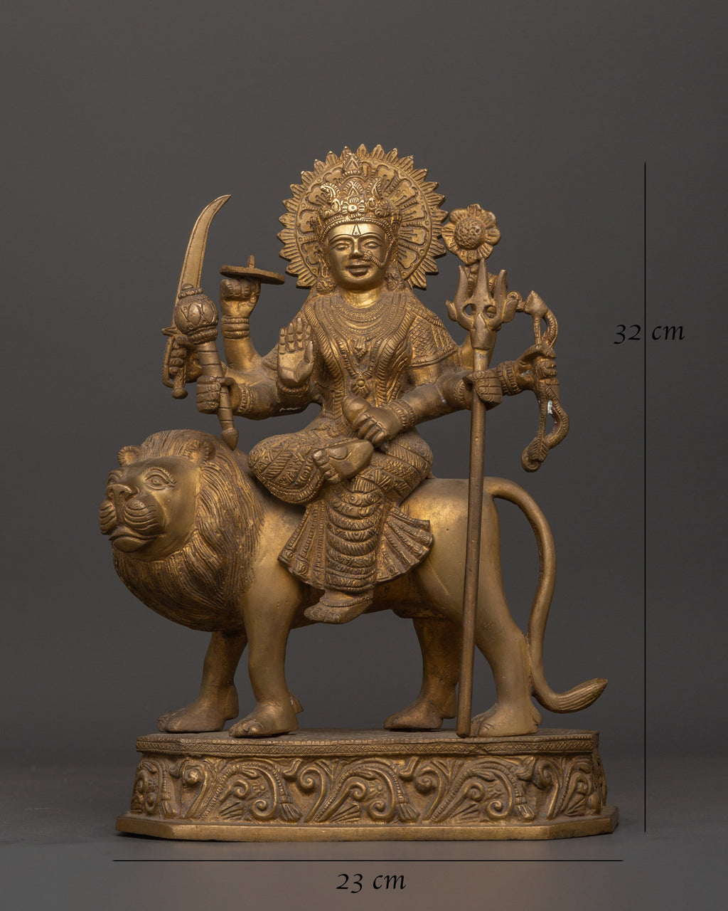 The Mighty Goddess Durga Brass Statue is a magnificent, handcrafted portrayal of the Hindu warrior deity, seated firmly atop a lion. This statue, measuring 32 cm in height and 23 cm in width, is cast in brass, making it a sacred addition to any home altar, meditation room, or spiritual design collection. Durga is shown in her majestic form, carrying a club, sword, conch, trident, bow and arrow, disk, and flower, which represent the weapons of righteousness, strength, and divine wisdom. Her right hand is uplifted in Abhaya Mudra, a symbol of courage and protection, providing a spiritual shield to all who seek her blessings.