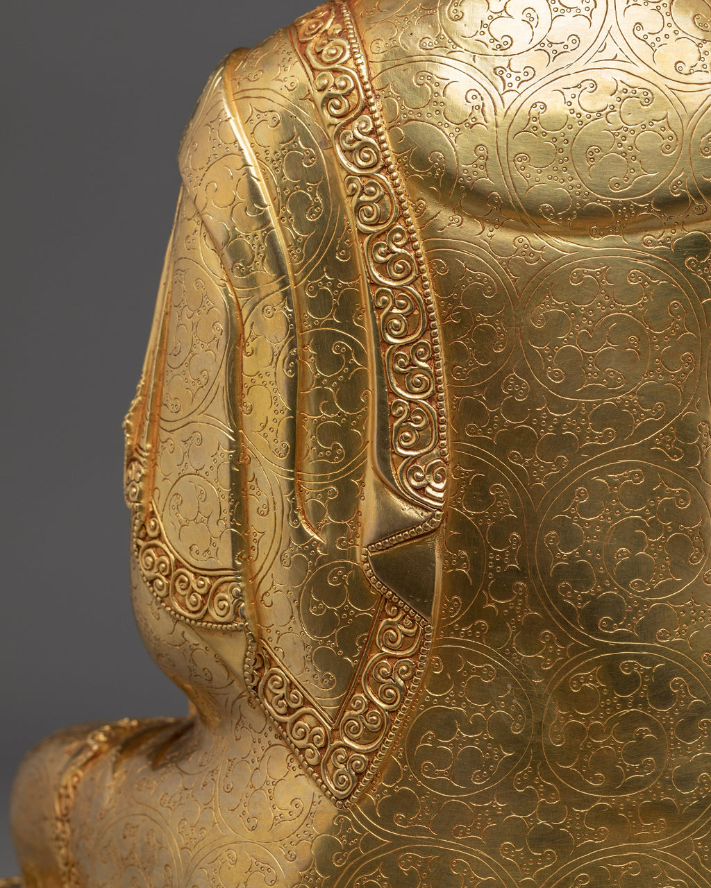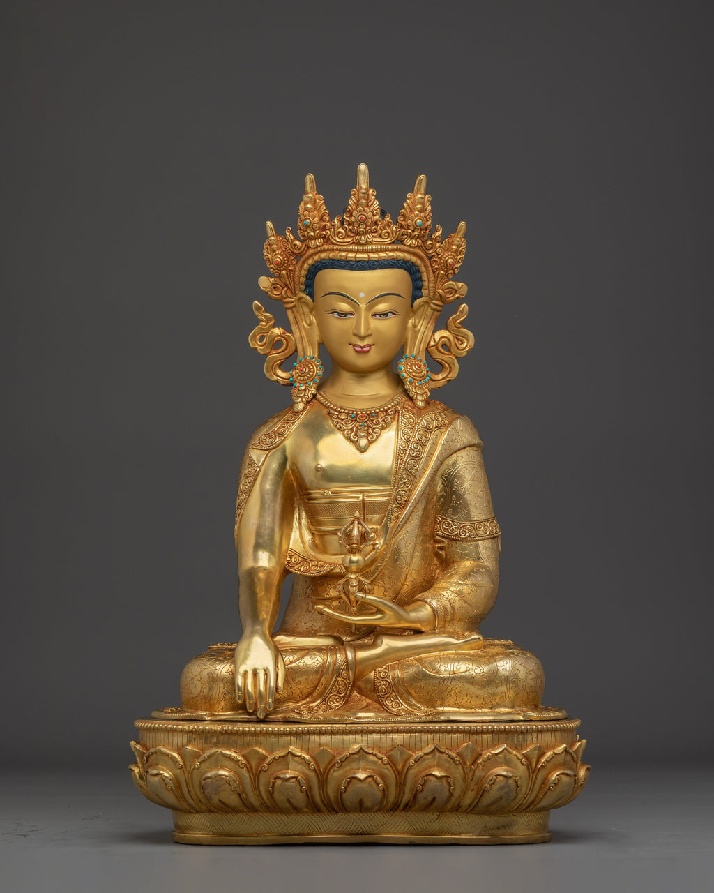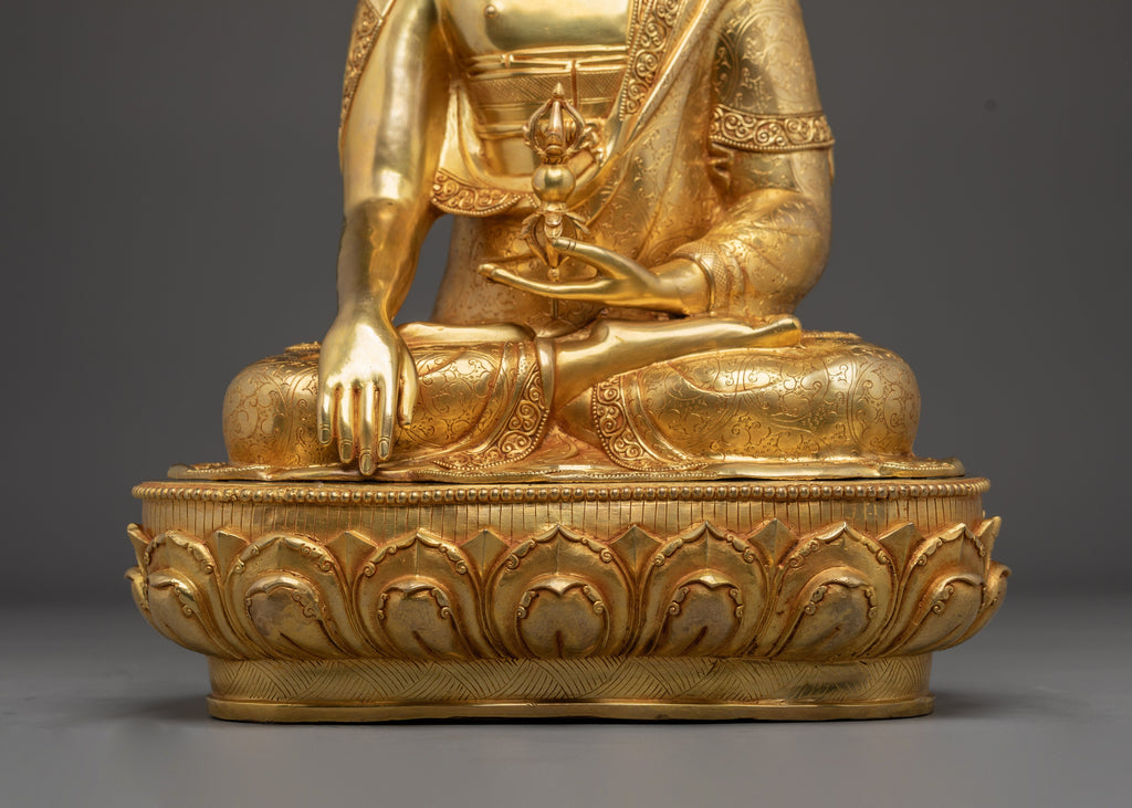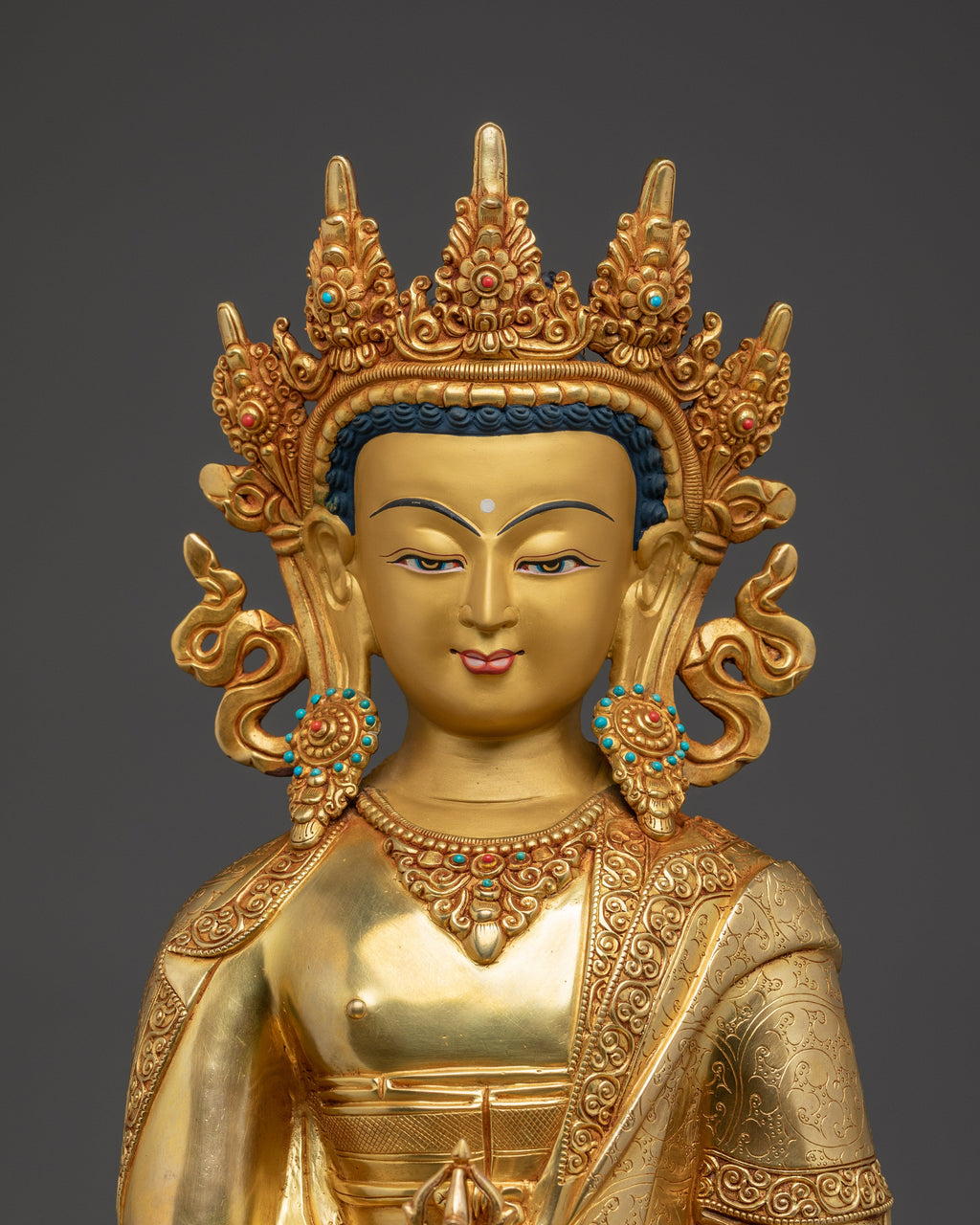 This Enlightened Mitrugpa Himalayan Statue stands 17.7” (45 cm) tall with a 12.2” (31 cm) base and weighs 8.47 kg. Crafted from copper and richly adorned with 24K gold gilding and intricate gold and acrylic paintings, it reflects the exquisite artistry of the Himalayas. It embodies enlightenment and spiritual power. Perfect for Buddhist home decor and meditation spaces.