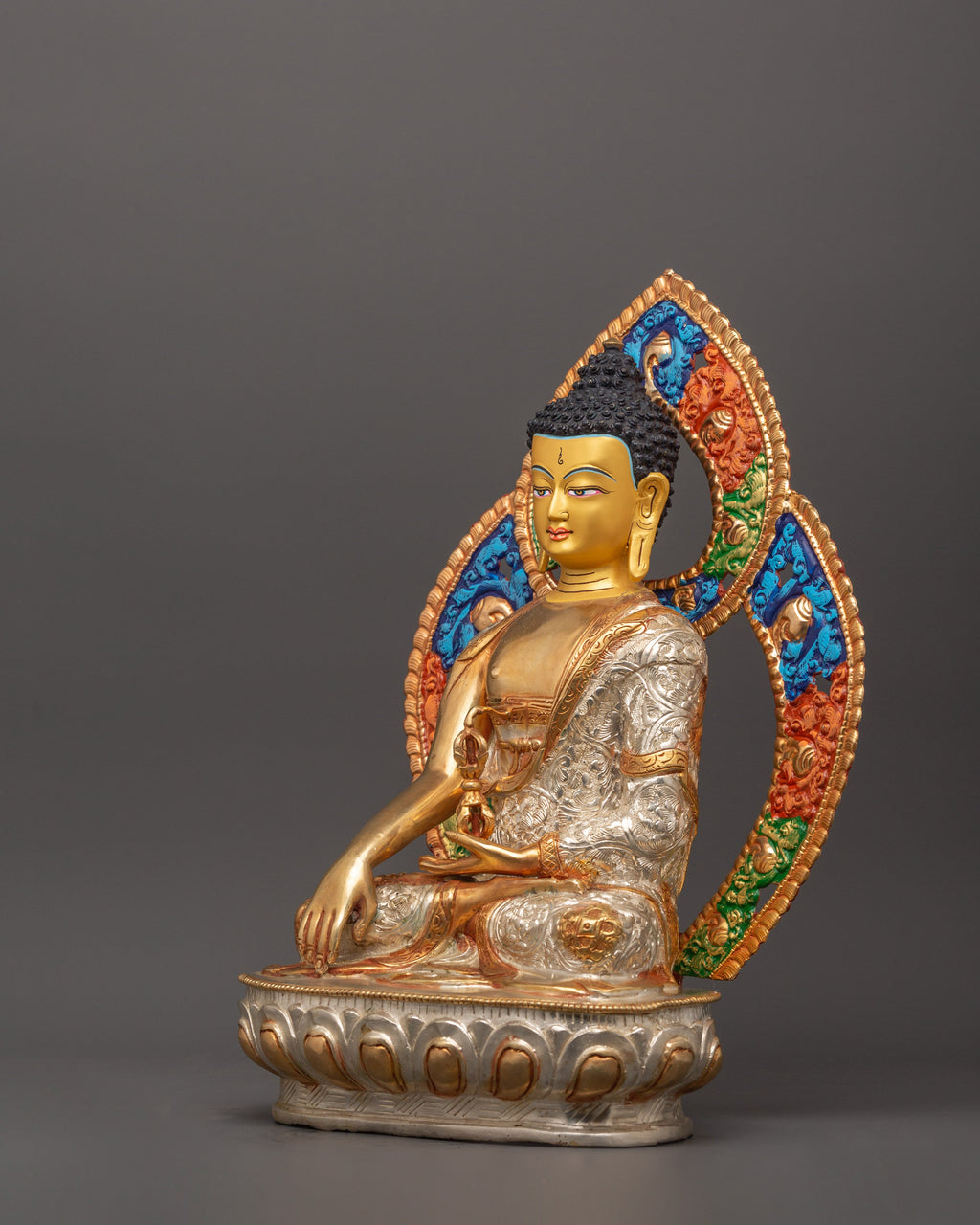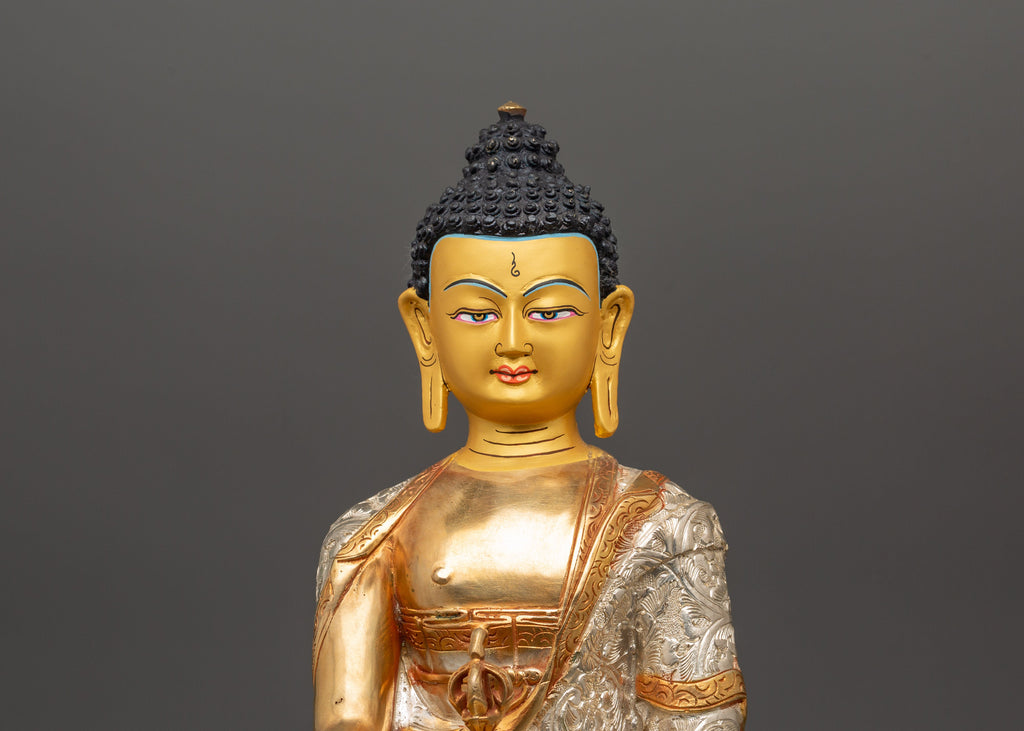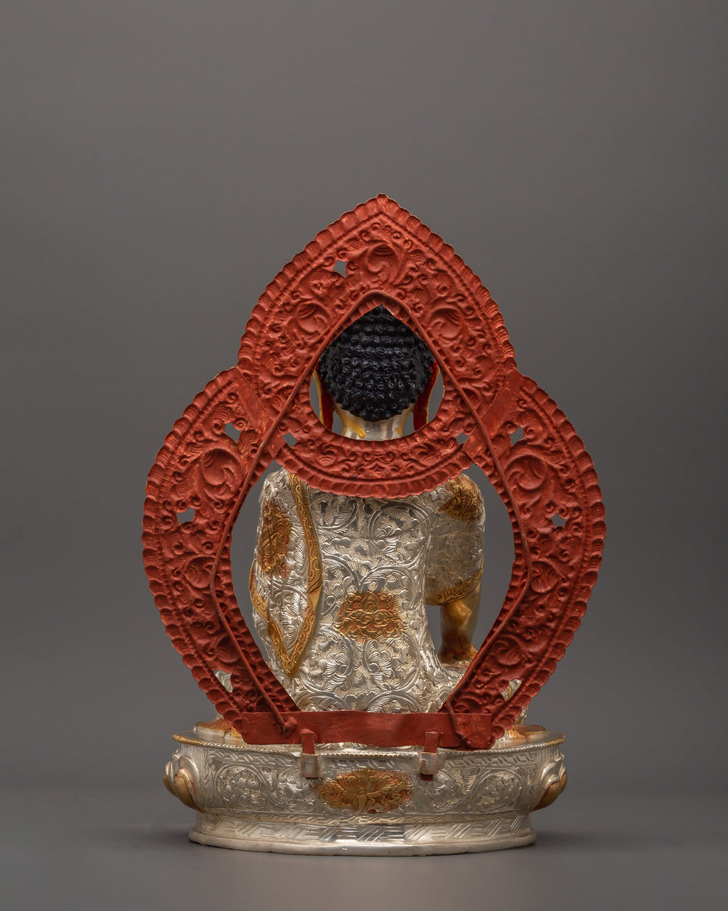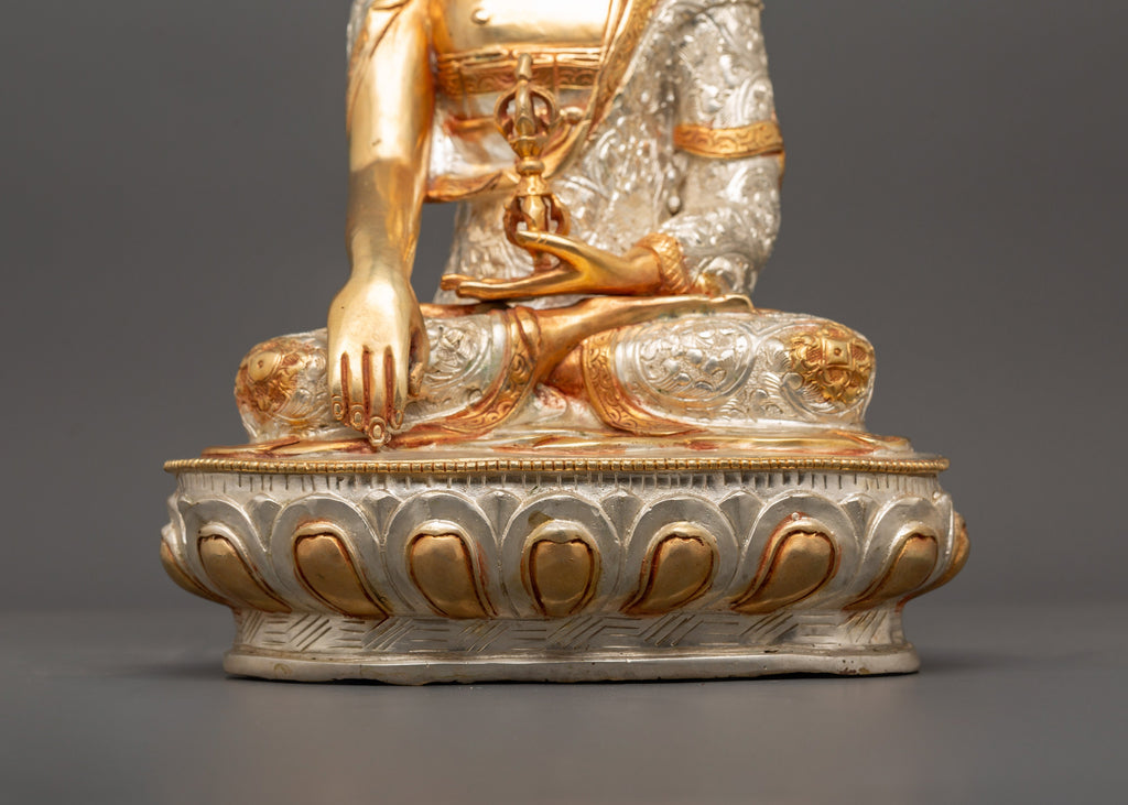 The Mitrugpa Buddha is serenely seated atop a moon disc lotus seat in a lotus posture. The lotus motif represents purity, enlightenment, and the triumph of spirit over adversity. The Mitrugpa Buddha symbolizes clean water, wisdom, and the ability to reflect objects without being affected by them. He holds a vajra, a ritual item, in his right hand while performing the 'Bhumisparsa mudra,' representing the moment the Buddha attained enlightenment, claiming the earth as his witness with his left hand. Its wonderfully crafted craftsmanship and spiritual significance make it an essential piece for Buddhist art collectors and those seeking spiritual connection.