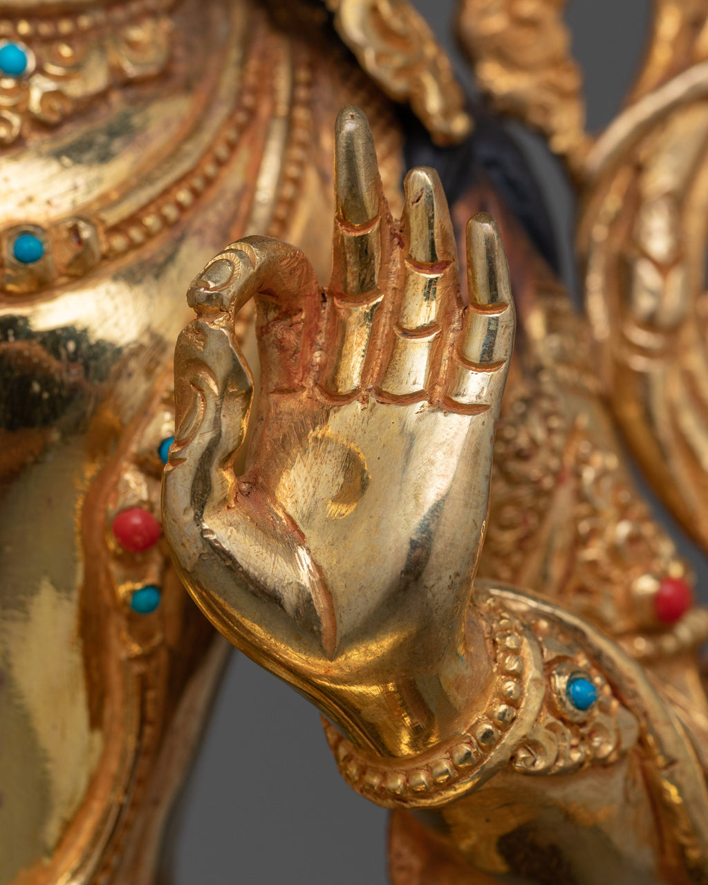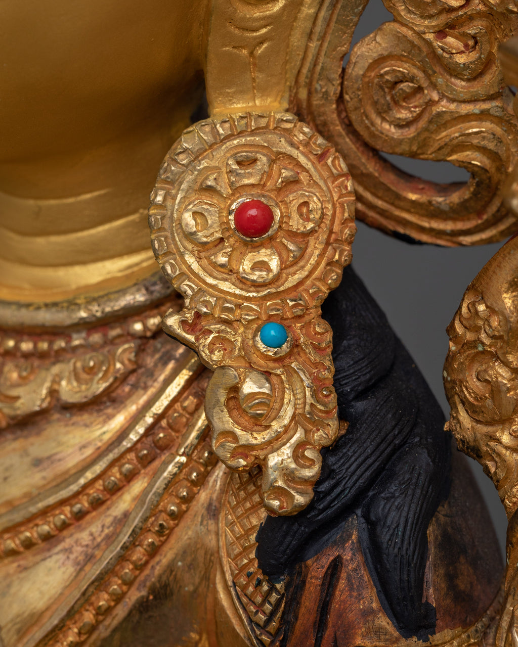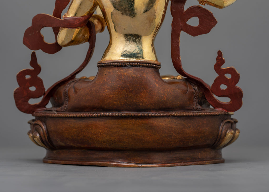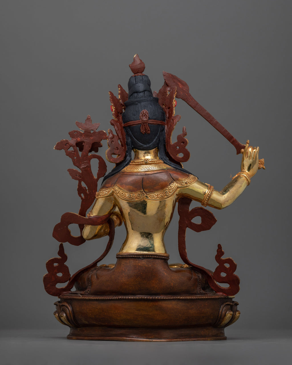This Monju Bosatsu God of Wisdom was made by talented craftspeople in Patan, Nepal, and has a copper body that is gilded in 24K gold and painted with vivid acrylic and gold. The scripture of Dharma, which stands for ultimate knowledge, and the sacred sword of wisdom, which represents the capacity to sever illusions, are held by Monju Bosatsu. The rich legacy of Nepalese workmanship is evident in every detail, which exudes divine grace and wisdom.