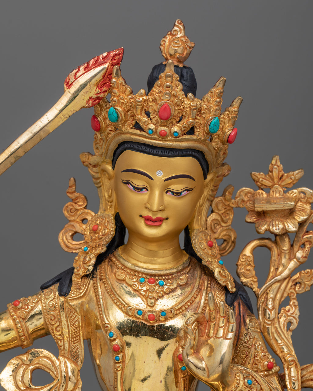 Manjushri, known as the Bodhisattva of Wisdom, is important to Mahayana Buddhist teachings. Manjushri is known for using his sword to cut through ignorance and delusion, and his presence in one's area promotes mental clarity and understanding. As a symbol of profound wisdom, he inspires those pursuing enlightenment.