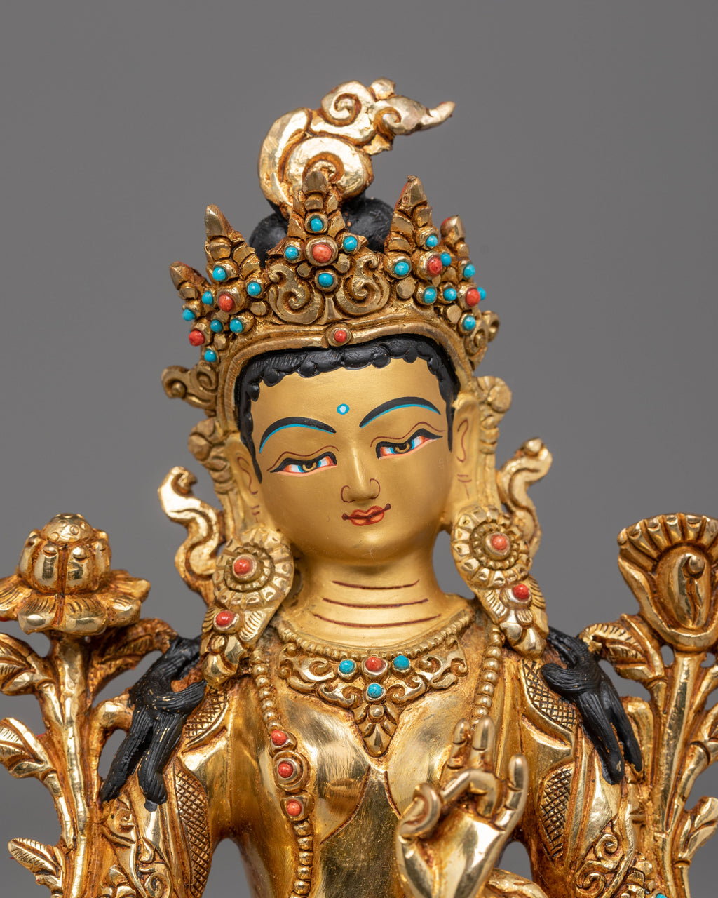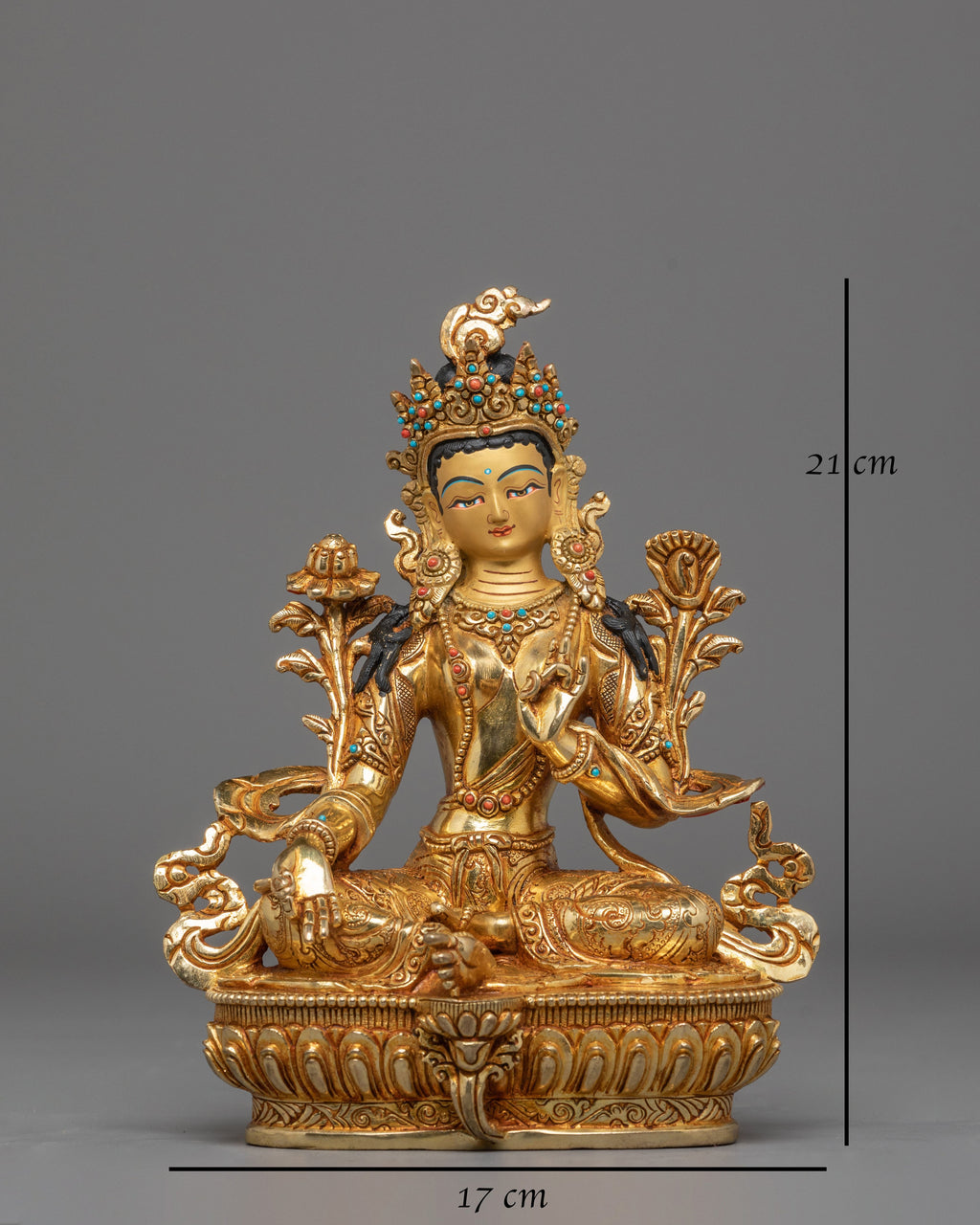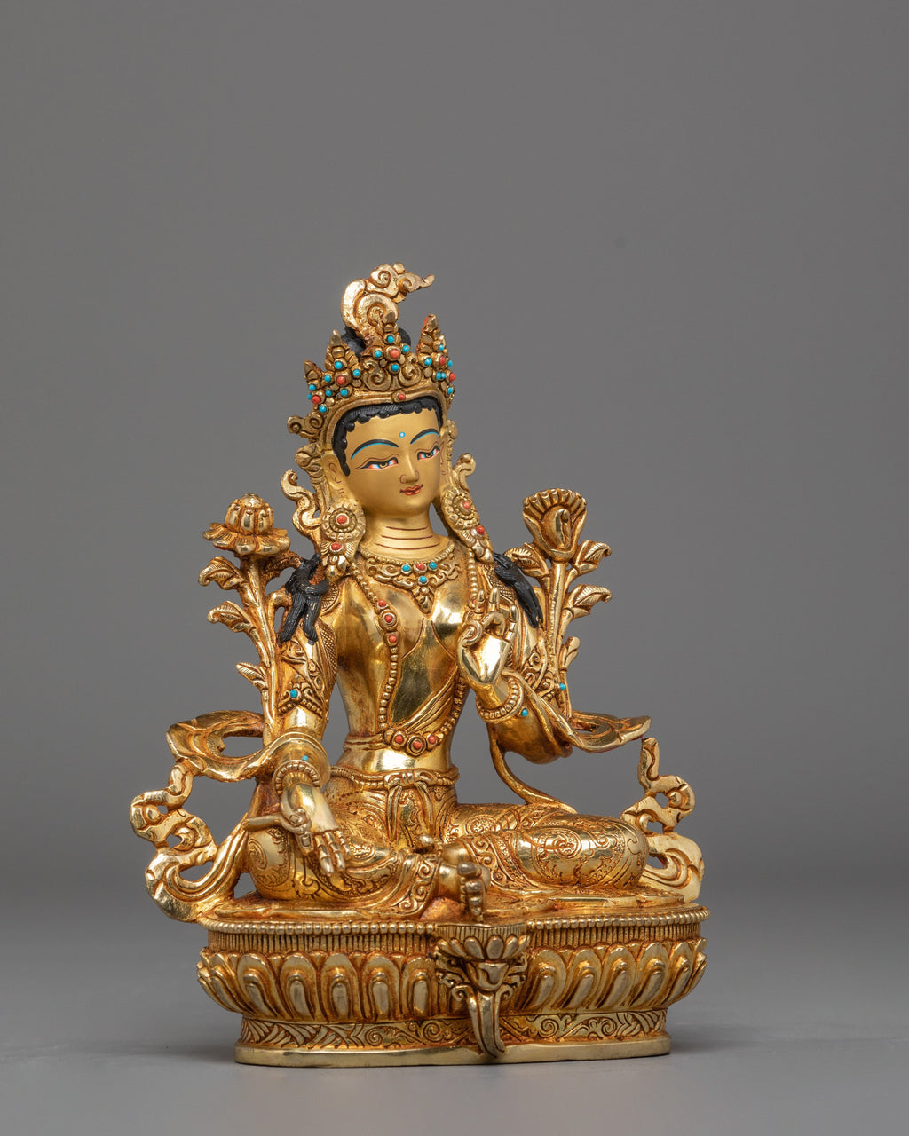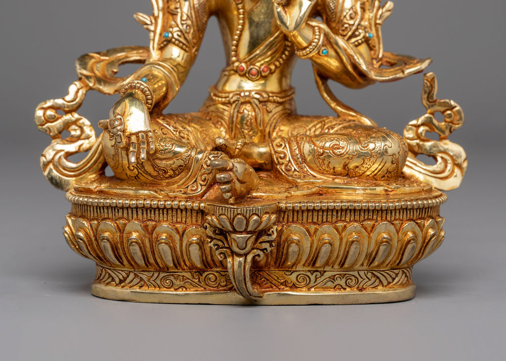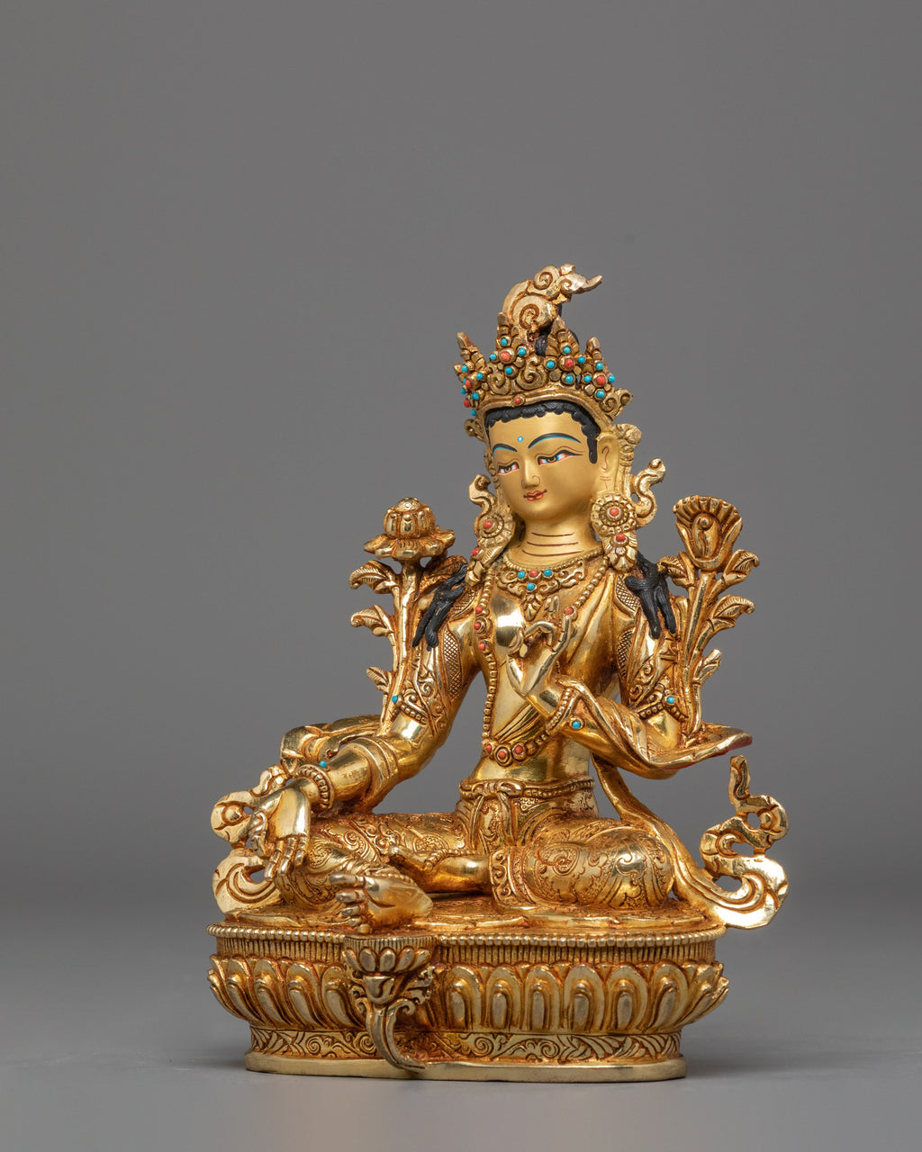 This gold-plated statue is further enhanced with artificial stone accents of coral and turquoise. These stones, known for their healing and protective properties, represent the goddess's nurturing qualities and spiritual significance. The coral brings protection, while turquoise symbolizes healing and vitality. The intricate design captures Shyama Tara with multiple arms, each holding symbolic items of power and peace. Her serene facial expression conveys deep compassion and wisdom, making this statue an excellent spiritual reminder for personal growth, healing, and protection.