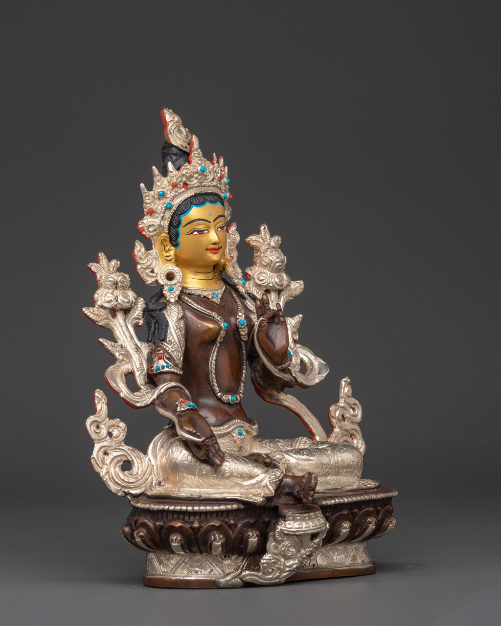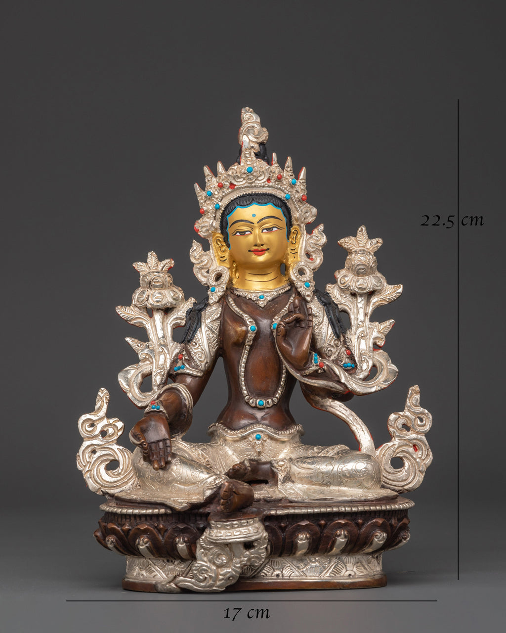 The Mother Shyama Tara Statue is a stunning handcrafted Tibetan Buddhist sculpture made from an oxidized copper body, richly silver-plated, and adorned with artificial coral and turquoise stones. With a height of 22.5cm, a width of 17cm, and a solid 1.59kg weight, this divine piece offers both visual presence and lasting durability. Its golden-painted face, serene expression, and beautifully sculpted crown showcase the artistry of Himalayan craftsmanship, making it a powerful symbol of protection, compassion, and enlightened action.