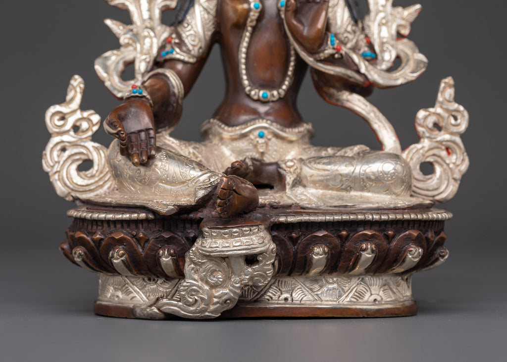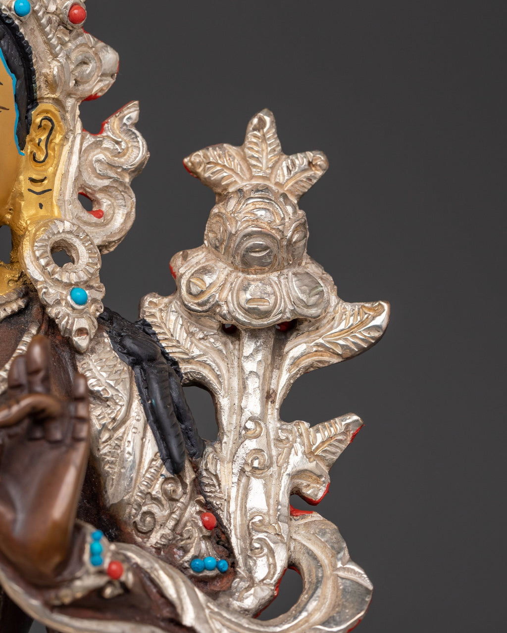 The design features intricate lotus motifs, symbolic hand mudras, and flowing robes, each carved with exceptional precision. The silver-plated detailing enhances the artwork's depth, while the turquoise and coral accents reflect traditional spiritual symbolism—representing healing, balance, courage, and sacred feminine energy. The harmonious blend of metals and stones gives the statue a radiant yet grounded aesthetic, ideal for elevating any spiritual environment.