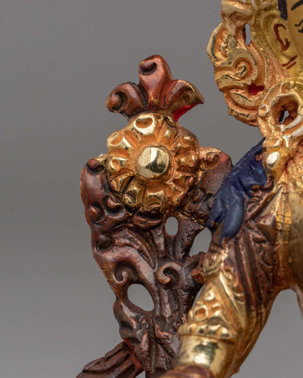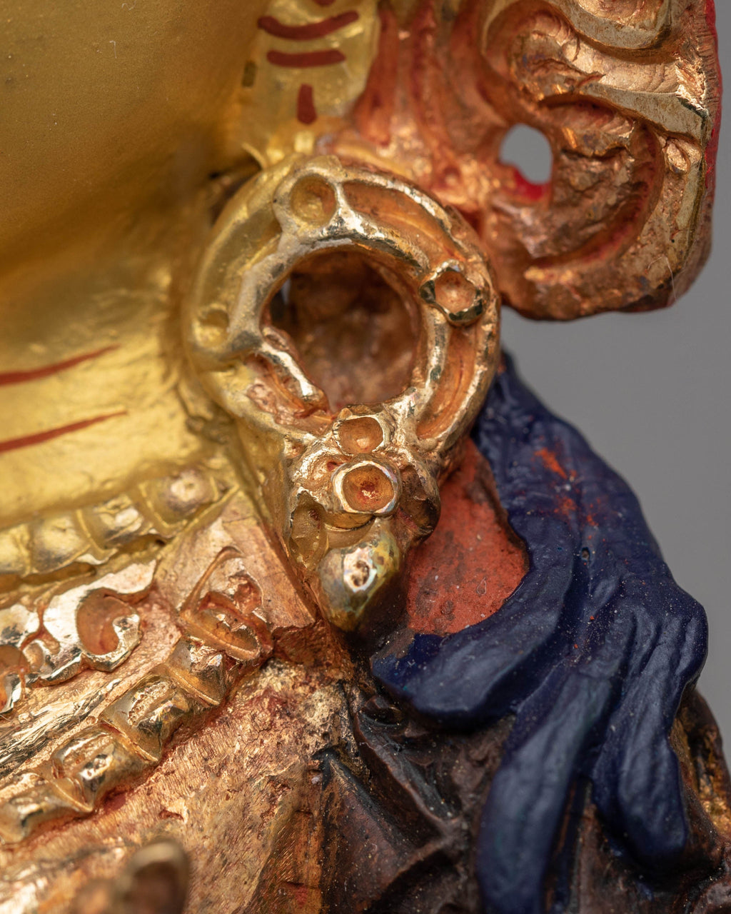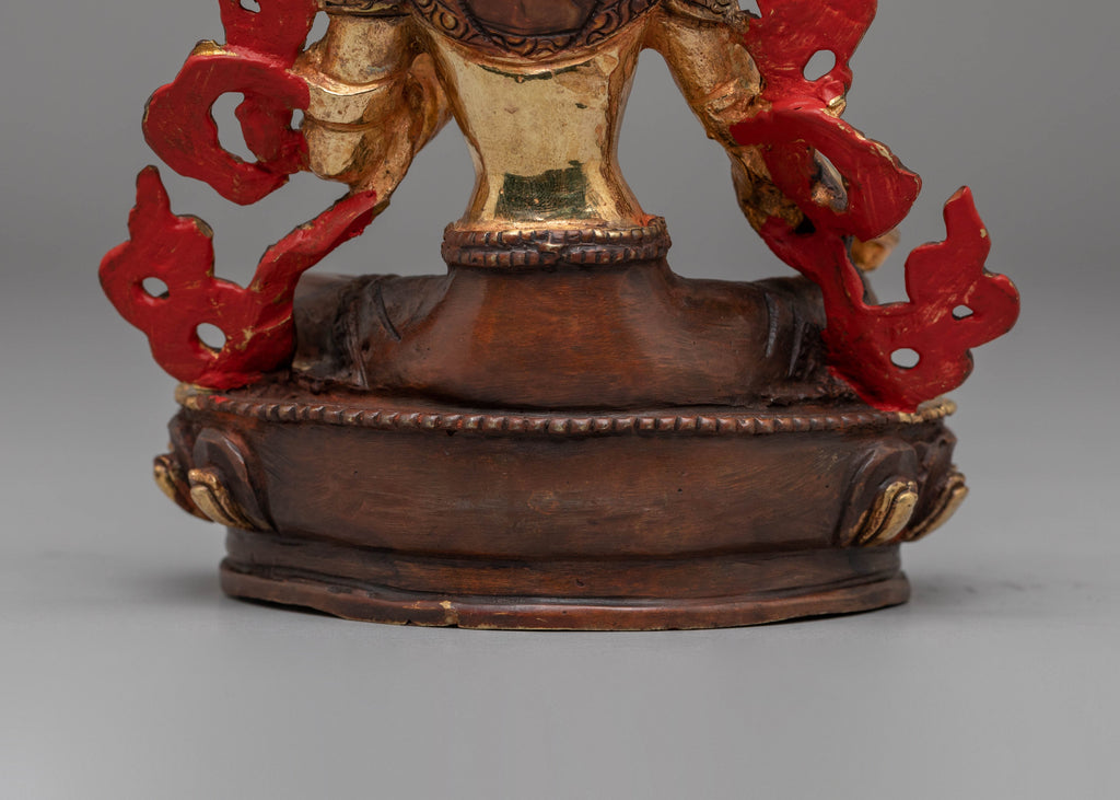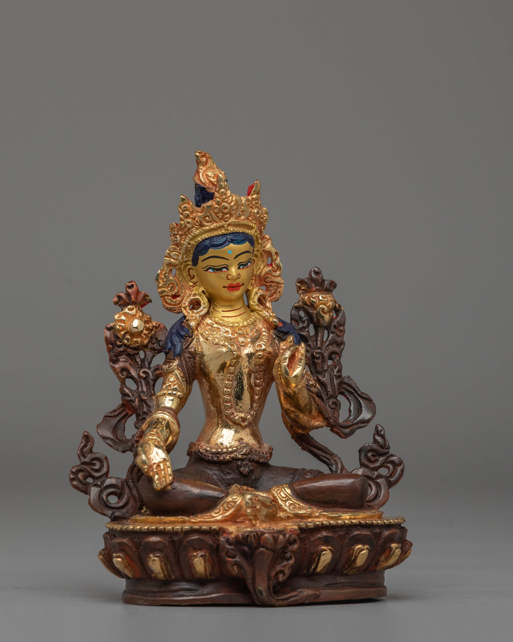 The statue's intricate detailing captures the essence of Green Tara's gentle nature, while the vibrant acrylic colors add depth and dimension to her divine form. The copper body provides a solid foundation, and the 24K gold plating enhances the piece's luxurious feel, creating a stunning visual contrast that highlights every curve and contour of the statue.