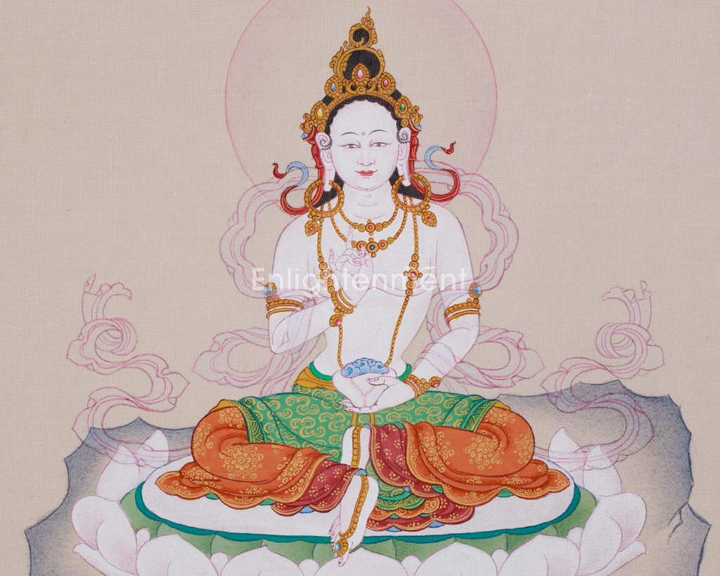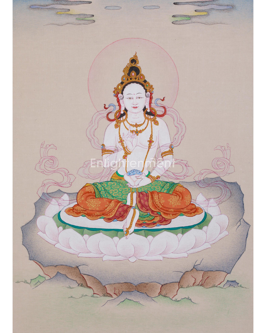 Yeshe Tsogyal, a revered Tibetan Buddhist figure and consort of Padmasambhava, symbolizes wisdom, devotion, and spiritual mastery. Recognized as one of the first female Tibetan lamas and Padmasambhava's foremost disciple, she helped bring Buddhism to Tibet and is considered the mother of the Tibetan Buddhist lineage. Her inspiring story of courage and deep understanding makes her a key figure in meditation and spiritual practice. In the artwork, she is portrayed seated on a lotus throne, surrounded by clouds and mountains, with a serene expression. While holding a skull cup symbolizes healing and blessings, she invites us to connect with her divine energy. Her right hand raised in a gesture of blessing and protection creates a warm and welcoming feeling. The intricate details of her robes and jewelry, accented with 24K gold, highlight her divine radiance and spiritual power. It serves as a heartfelt reminder of feminine strength, wisdom, and spiritual enlightenment.