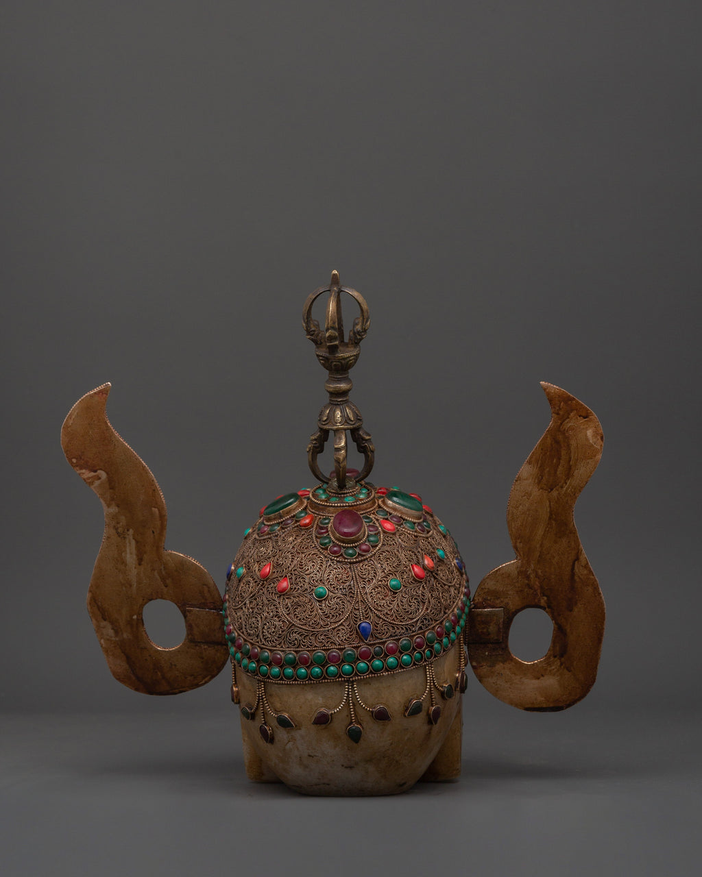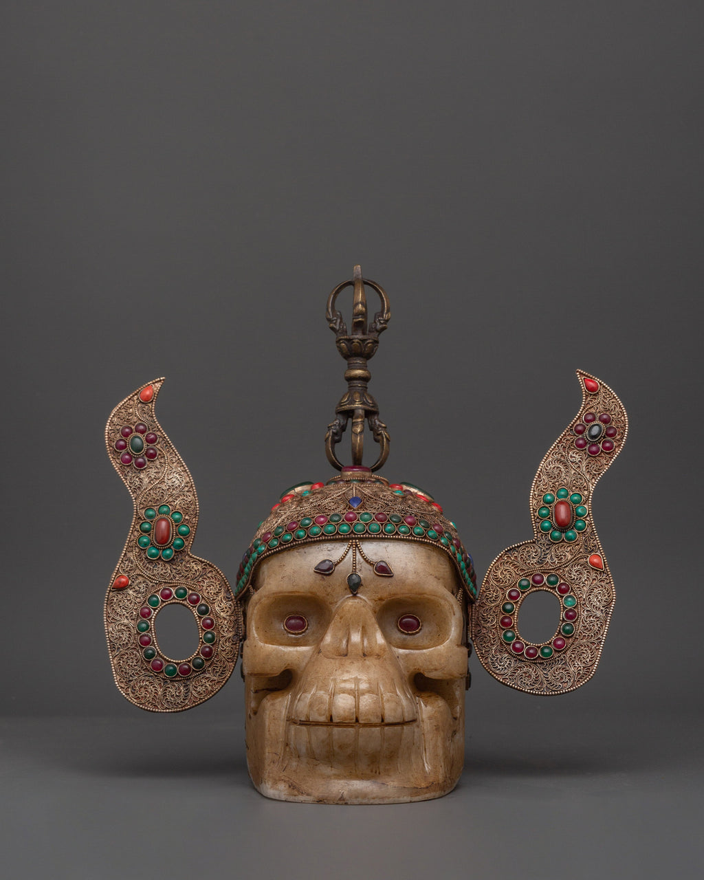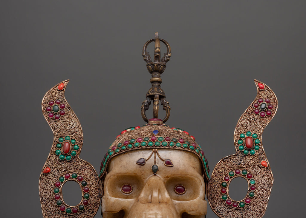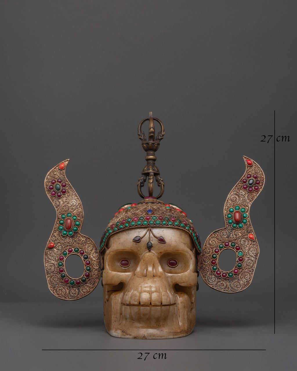 Enhance your home with this stunning Mystic Skull Decor, a handcrafted masterpiece made of copper with silver plating and inlaid with brilliant coral, turquoise, and crystal stones. This unique spiritual home accent combines sacred meaning with vivid artwork, making it an effective piece for collectors and home décor enthusiasts. This skull, which measures 27cm in height and 27cm in width, is topped with a vajra symbol, an old Tibetan Buddhist emblem of force and spiritual awakening. The skull's shape is further enhanced by two prominent, stylized ear patterns that are abundantly embellished with brilliant inlays of coral and turquoise, giving it a boho-tribal charm.