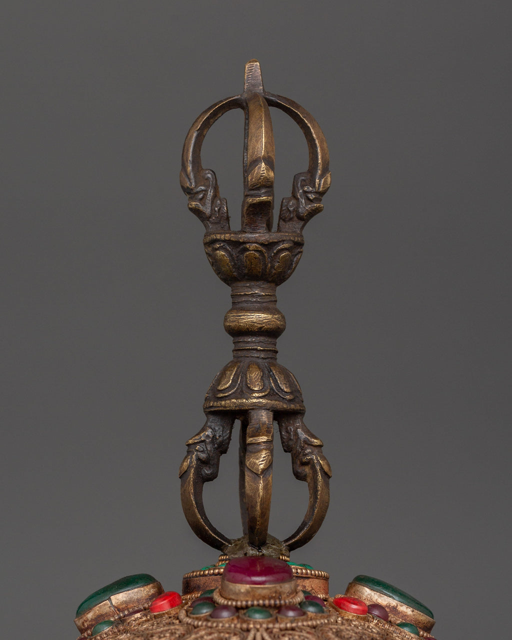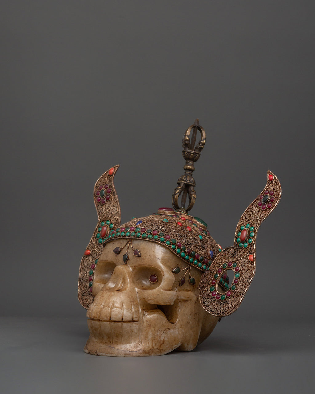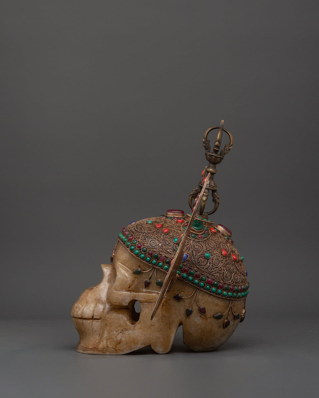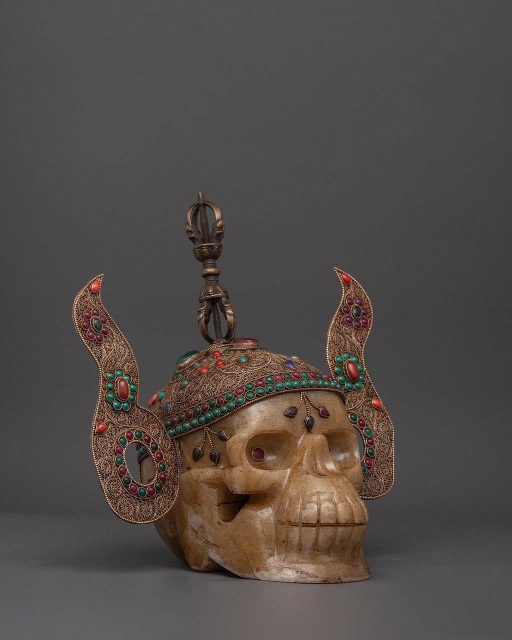 Enhance your home with this stunning Mystic Skull Decor, a handcrafted masterpiece made of copper with silver plating and inlaid with brilliant coral, turquoise, and crystal stones. This unique spiritual home accent combines sacred meaning with vivid artwork, making it an effective piece for collectors and home décor enthusiasts. This skull, which measures 27cm in height and 27cm in width, is topped with a vajra symbol, an old Tibetan Buddhist emblem of force and spiritual awakening. The skull's shape is further enhanced by two prominent, stylized ear patterns that are abundantly embellished with brilliant inlays of coral and turquoise, giving it a boho-tribal charm.