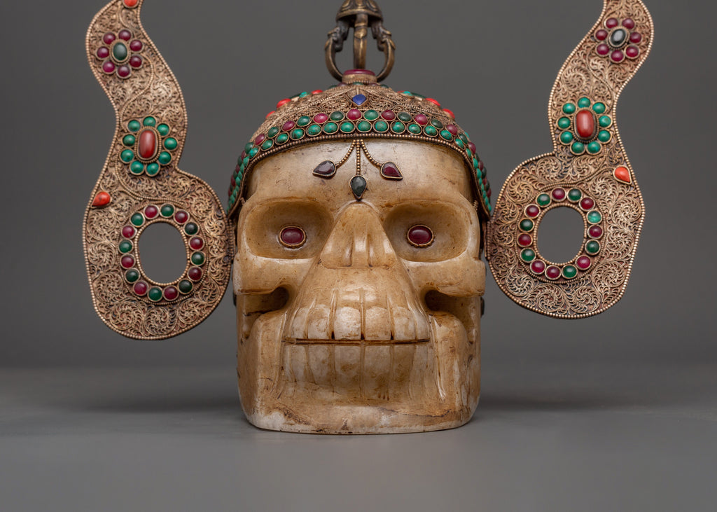 This handmade gothic artwork is ideal for individuals who value spiritual symbolism, bohemian decor, or mystical antiques. This skull, whether displayed in a meditation chamber, on a sacred altar, or as a bold conversation piece in your home, combines the raw energy of traditional Himalayan workmanship with modern design trends. The combination of stones, spiritual symbols, and old metallic textures is an outstanding addition to your home decor, ideal for people drawn to deeper meanings and ancient energies.