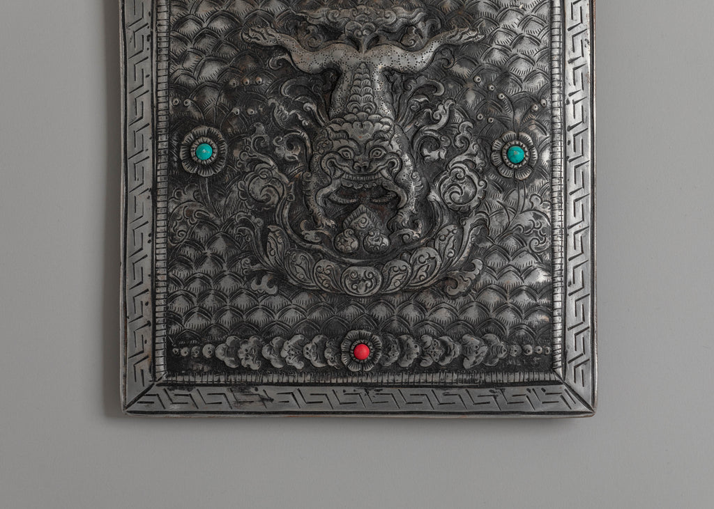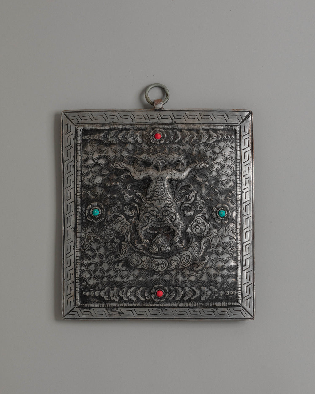 This Mystical Guardian Creature Wall Decor is a powerful statement piece inspired by traditional Himalayan protective symbolism. Crafted from an iron body and adorned with vibrant artificial turquoise and coral stones, this wall plaque features an intricately carved guardian creature surrounded by swirling cloud-like patterns and layered motifs. The expressive central figure represents protection, strength, and energetic safeguarding, making it a meaningful addition to any spiritual or artistic space.