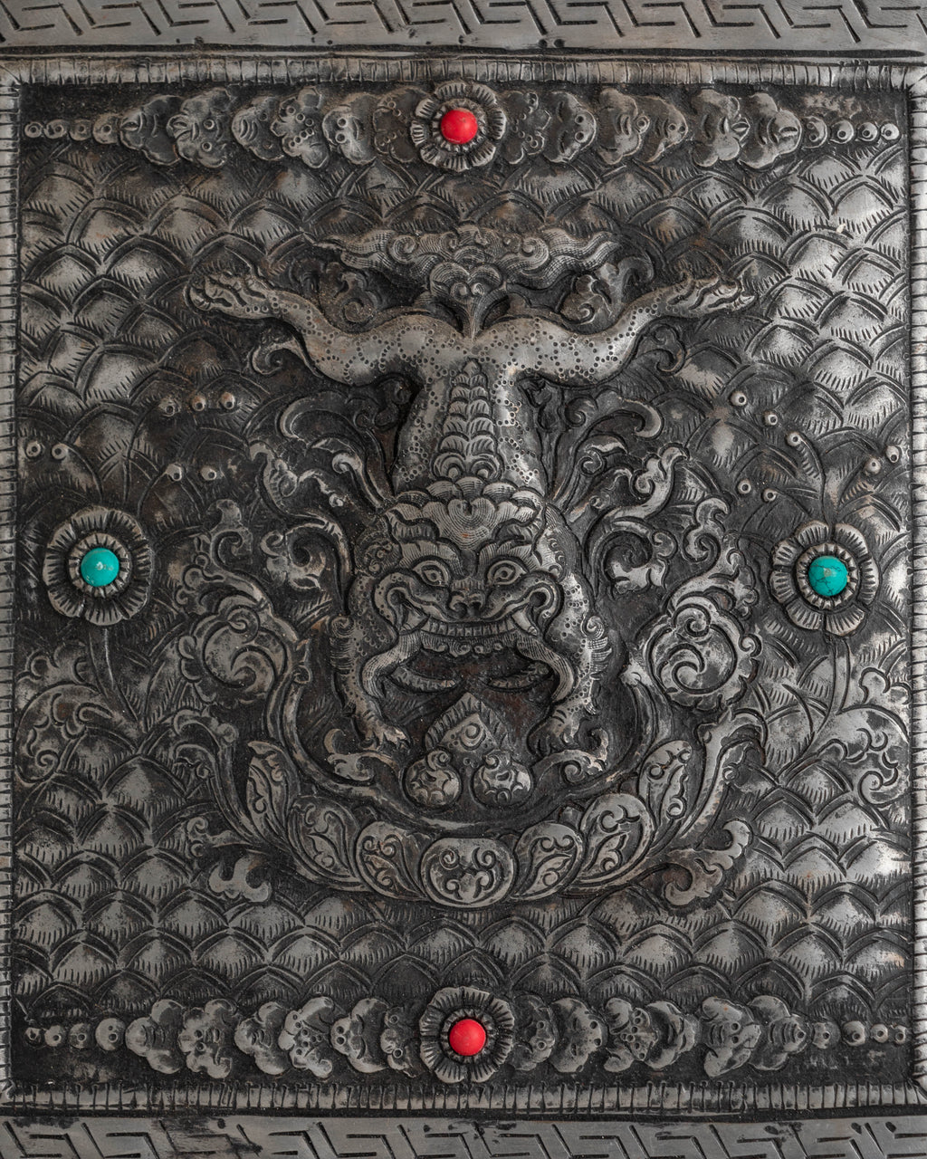 The detailed patterns surrounding the guardian include scaled textures, flowing ornamental forms, and a framed border featuring classic cultural designs. Each engraved element contributes to the piece’s bold, mystical presence, drawing the eye toward the center, where the guardian’s expressive face emerges. The turquoise and coral accents enhance the visual depth and add a touch of color contrast that complements the darker iron surface.