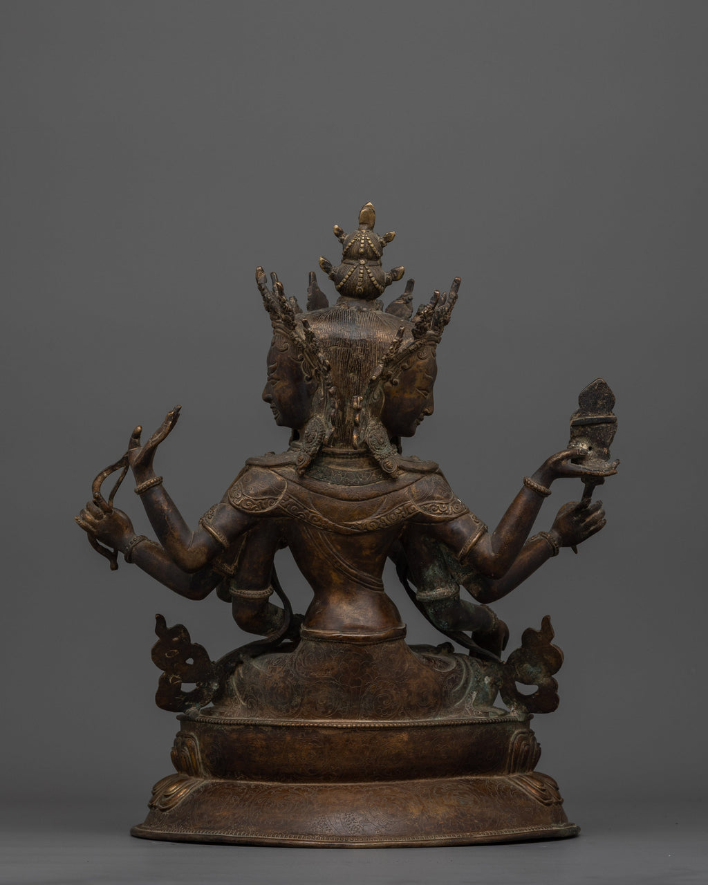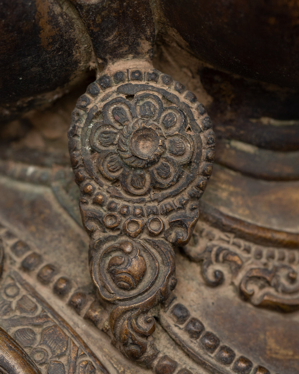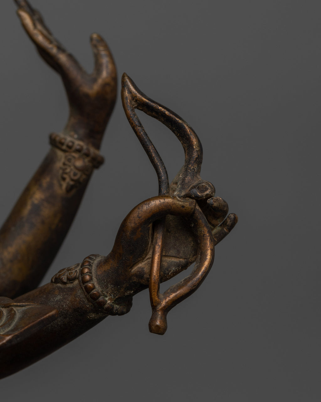 The Namgyalma Dakini figurine stands 14.8" (37.5 cm) tall and 12.6" (32 cm) wide at the base. It is made of oxidized copper and has an antique finish that evokes timeless beauty and represents divine protection and timeless knowledge. It weighs 6.03 kg and is a representation of Namgyalma, the goddess of longevity, who bestows health, vigor, and enlightenment upon everyone who sees her.