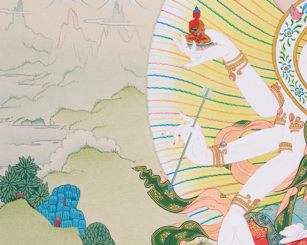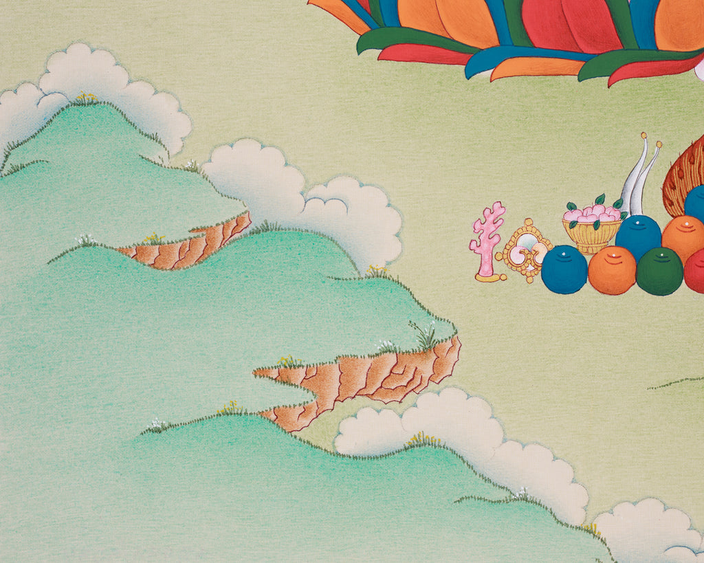 A Namgyalma Painting, an original hand-painted thangka from our Enlightenment Studio, uses acrylic colors on pure cotton with 24K gold. It combines vibrant colors and gold shimmer to symbolize spiritual illumination and purity. Painted in the traditional Karma Gadri style, renowned for its elegance, delicate lines, and expansive landscapes, it embodies sacred artistry and meditative workmanship. Each stroke is infused with mantra and mindfulness, making it a vessel of spiritual energy and longevity.