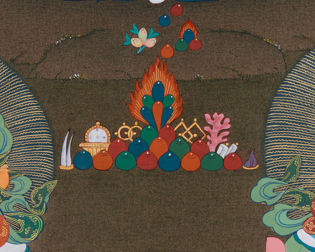 These three deities collectively represent total protection and the gathering of wealth, encompassing both material and spiritual abundance. Namtoshe offers safeguarding against loss and harm, Dzambhala draws wealth toward the devotee, and Vasundhara fosters growth and nourishment. Possessing this Thangka symbolizes inviting prosperity, protection, and spiritual growth into one's life. It functions as a potent talisman for personal devotion or an inspiring piece for a collection, embodying themes of abundance and resilience.