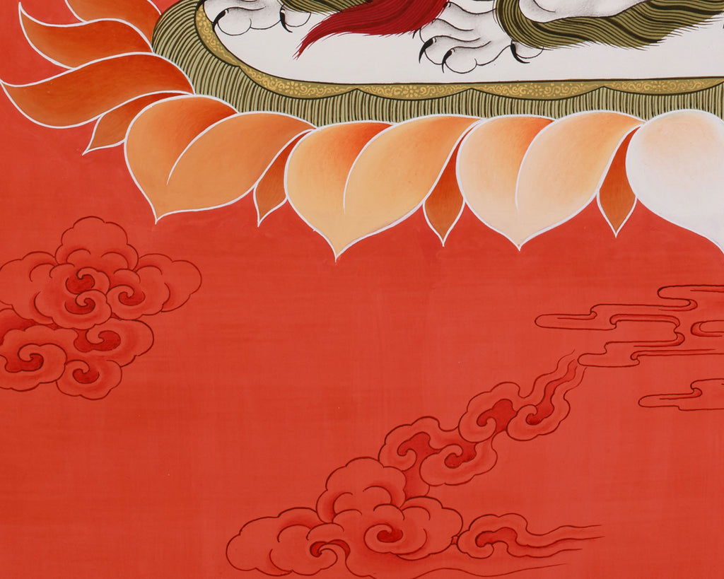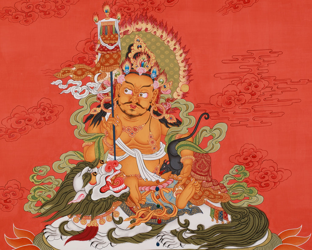 The Namtose Buddha thangka is a wealth deity specifically associated with the prosperity that arises from engaging in spiritual activities. He is depicted seated on a snow lion, symbolizing courage and strength. His calm yet fierce expression conveys his capacity to overcome challenges and his role as a compassionate supporter. In his right hand, he holds a victory banner (dhvaja), signifying triumph over negativity and ignorance. In his left hand, he holds a mongoose that emits priceless gems, symbolizing the endless supply of wealth and abundance awaiting those who follow the path of righteousness. It is meticulously painted on cotton canvas in the traditional Tibetan style. Its beauty and spiritual significance are enhanced by the use of genuine 24K gold and acrylic colors.