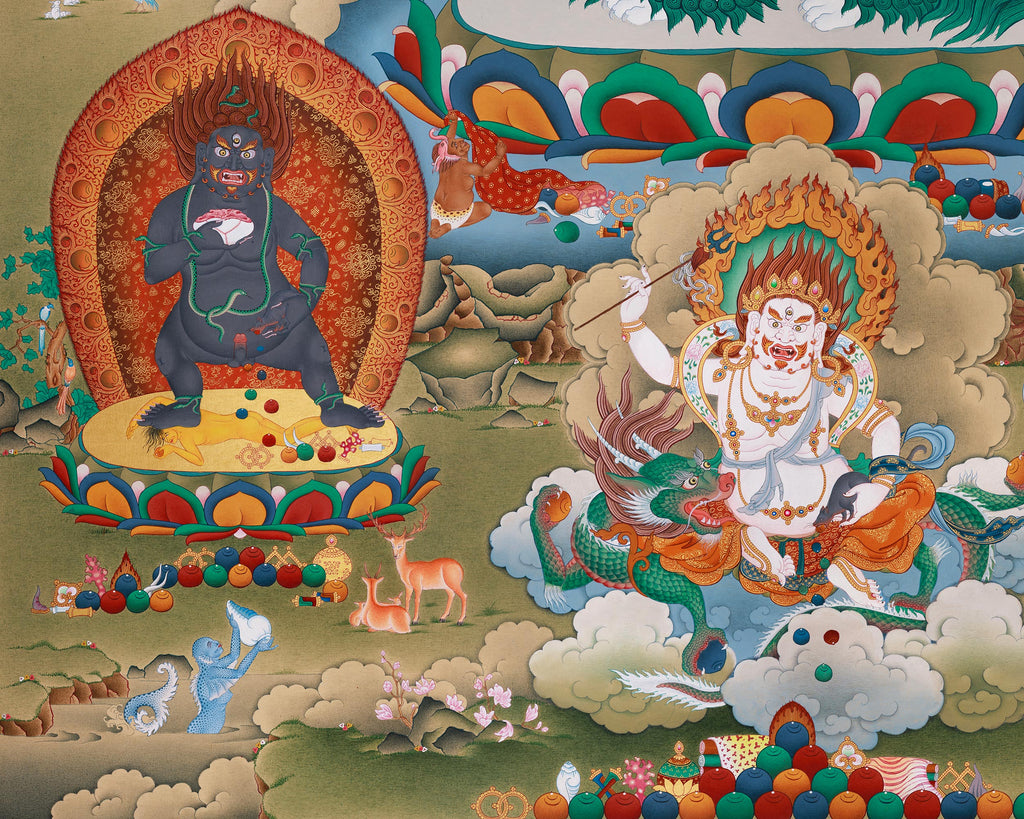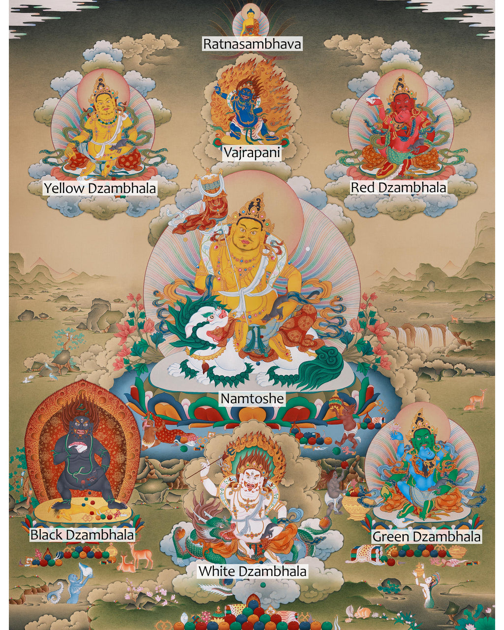 Namtoshe is a central figure in Tibetan Buddhism, embodying the qualities of wealth, generosity, and spiritual protection. Often depicted as a powerful deity, Namtoshe is revered for his ability to remove obstacles and bring blessings of prosperity to practitioners. Alongside him are the five Dzambhala figures—each representing a different aspect of wealth and abundance—whose presence in this thangka symbolizes the harmonious balance of material and spiritual prosperity.