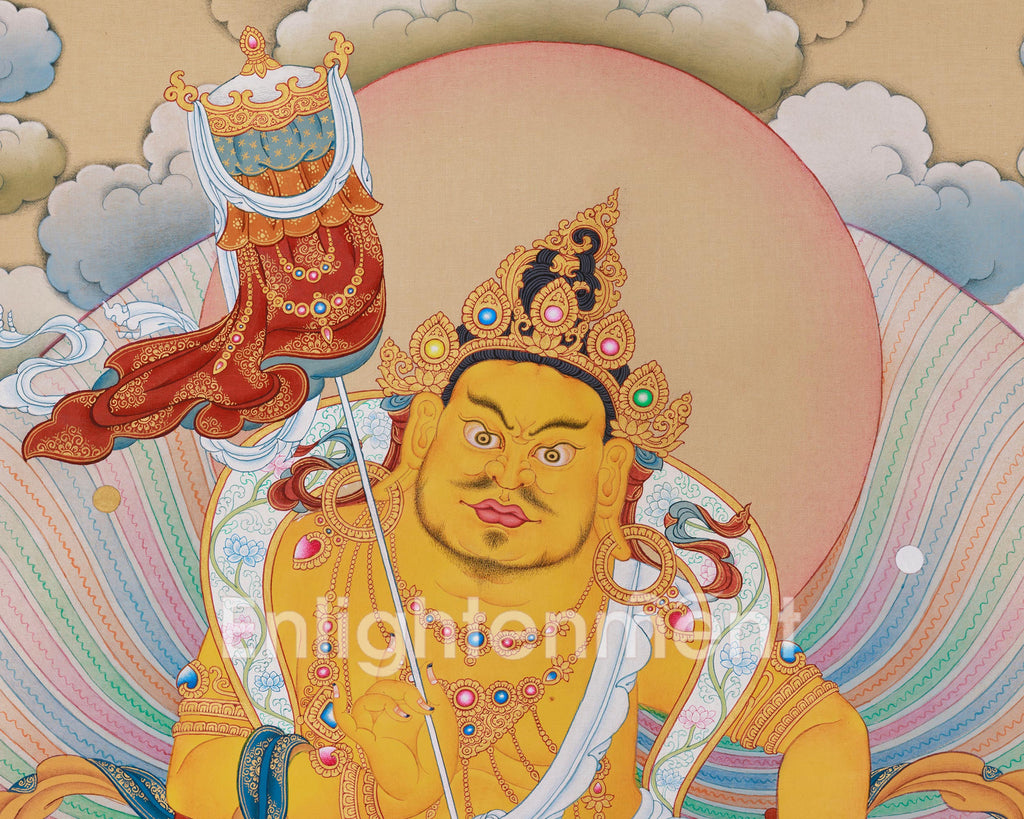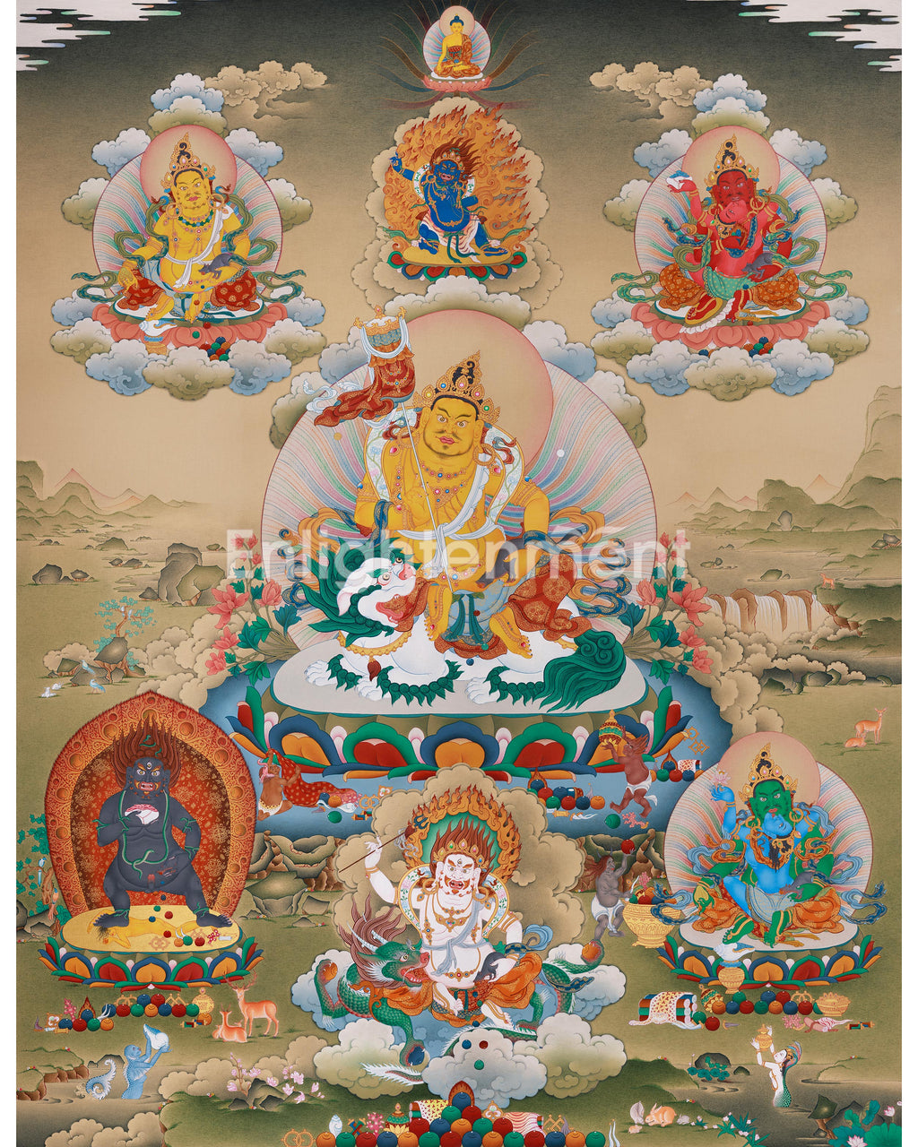 Presenting the Namtoshe with five Dzambhala Thangkas, awe-inspiring spiritual artworks that embody divine wealth, prosperity, and protection. This hand-painted piece measures 40 inches wide and 50 inches high. Created using high-quality materials such as cotton canvas, natural Lhasa stone colors, and 24K gold, it reflects the traditional craftsmanship of Karma Gadri. Created in our enlightenment studio in Kathmandu, Bouddha, Nepal, this thangka is an original piece that reflects the profound wisdom passed down through our tradition. Painted by Karma Gadri artists from Kham, Eastern Tibet, this piece authentically represents Tibetan Buddhist art and spirituality. The artwork features vibrant colors, detailed designs, and deep spiritual significance, making it an ideal addition to your sacred space or meditation area.