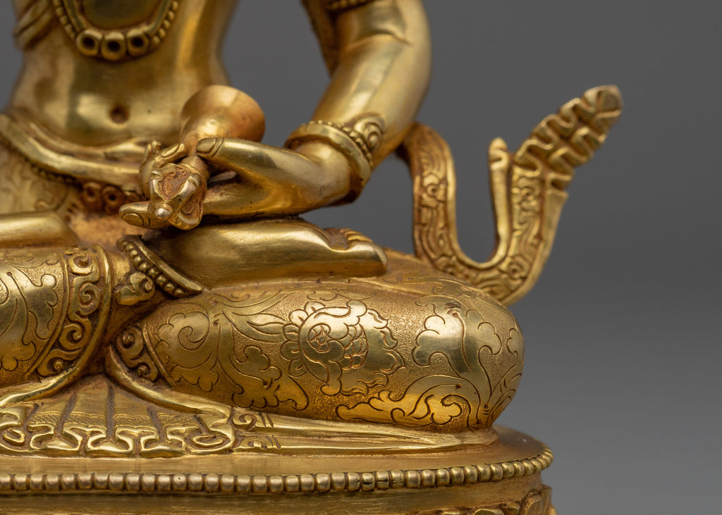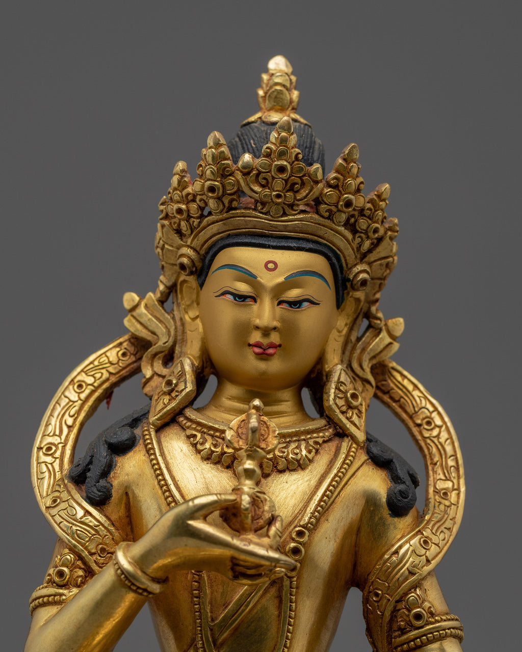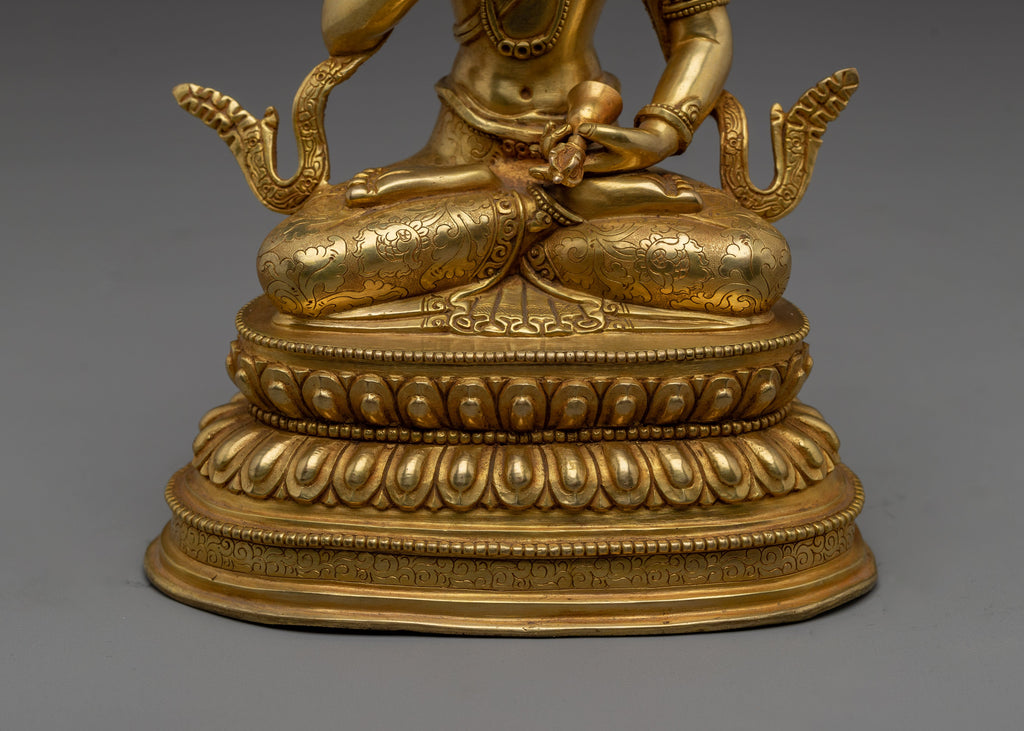 This Vajrasattva, also known as Dorje Sempa, stands at 9.3”/23.5cm in height and 6.3”/16cm at the base, weighing 1.95 kg. Made from 24K Gold Gilded, gold, and acrylic paintings, with a Copper Body, this piece reflects traditional craftsmanship. Designed by talented Nepalese artisans, this piece is ideal for altars, meditation areas, or as a meaningful decorative item for individuals seeking to cultivate awareness in their daily life.