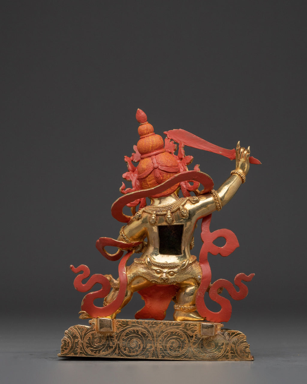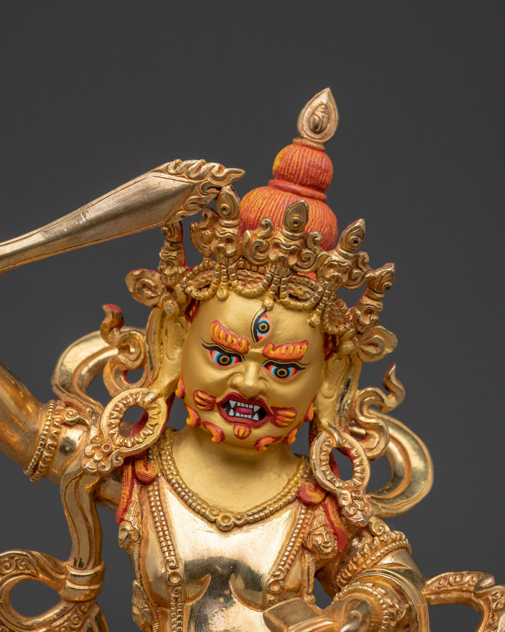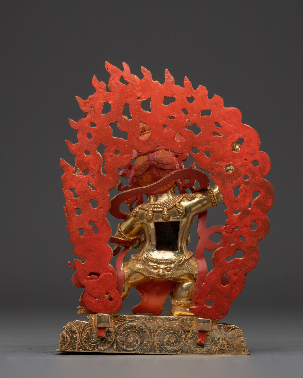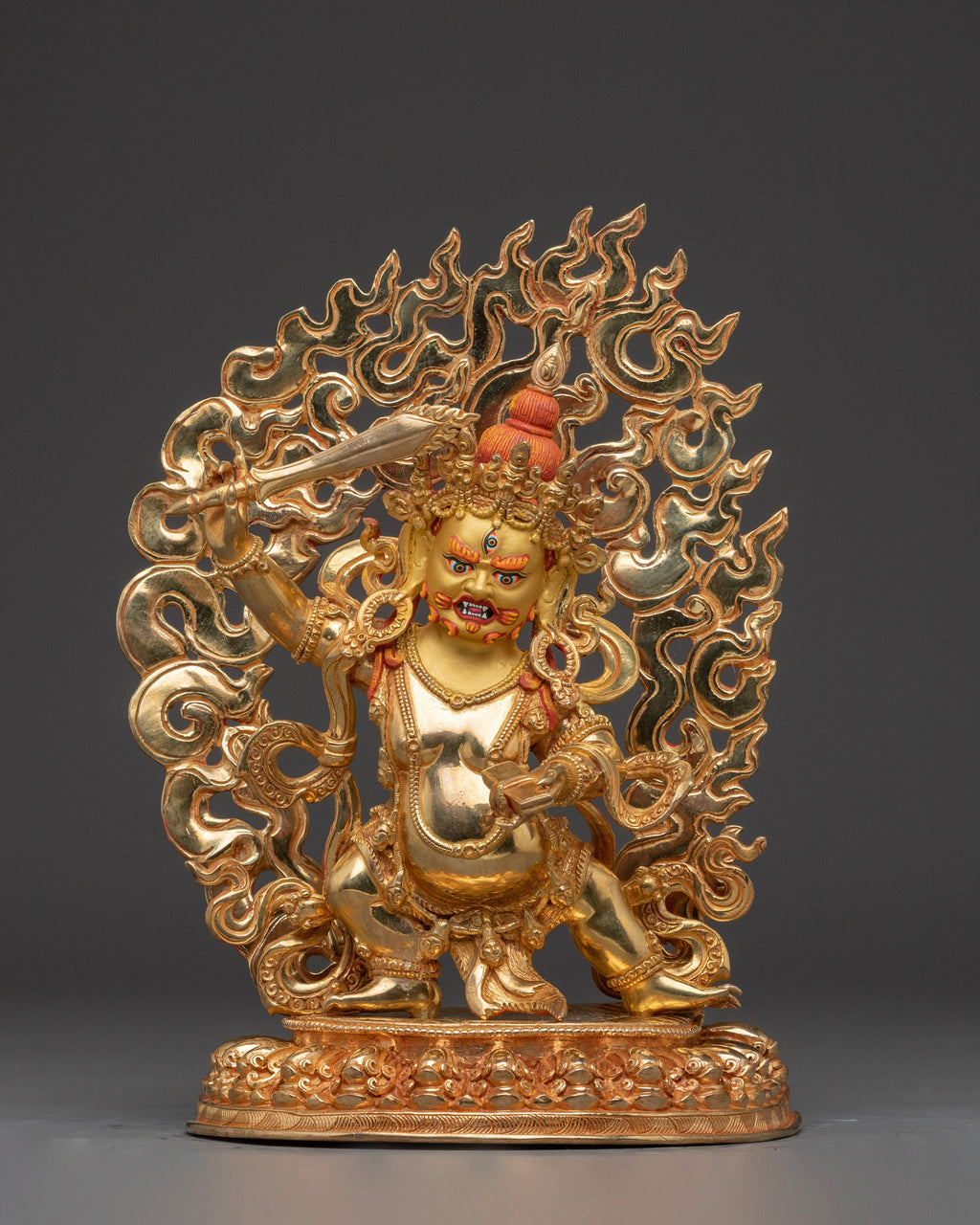 Black Manjushri typically has one face and two arms, with a wrathful or semi-wrathful expression, featuring three glaring eyes and fangs, conveying his fierce compassion and power to overcome harmful influences. He is often shown seated in vajra posture or standing, with one leg bent and the other extended, signaling readiness for action. In his right hand, he holds a flaming wisdom sword raised aloft, symbolizing the cutting through of ignorance and delusion with sharp clarity and insight, with the flames emphasizing purification and transformative energy. His left hand holds the stem of a lotus flower on which the Prajnaparamita (Perfection of Wisdom) scripture rests, representing the embodiment of wisdom and the teaching of emptiness. Black Manjushri is adorned with a five-skull crown, representing the Five Wisdoms of the Buddha, each skull symbolizing the transformation of the five poisons (ignorance, desire, hatred, pride, and jealousy) into wisdom. Atop his head, a prominent ushnisha signifies his supreme wisdom and enlightened consciousness. Surrounding him is a flaming halo, which represents the primordial wisdom of the Buddha, burning away all obstacles and ignorance, and symbolizing his role as a powerful force of transformation and purification. He is also draped in silks, jewels, bone ornaments, and tiger skin garments, further emphasizing his fearsome yet compassionate nature, and he is often surrounded by flames, symbolizing wisdom and the power to purify the mind.