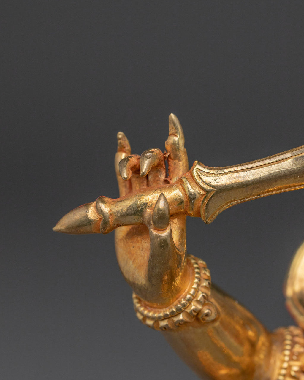 Nepalese Artwork of Black Manjushri stands 30cm tall and 23cm wide, with a substantial weight of 3.96kg. Created from Copper Body, 24k Gold Gilded, and Gold and Acrylic paintings, it embodies the transcendent wisdom of Mahayana and Vajrayana Buddhism. Manjushri, the Bodhisattva of Wisdom, is often depicted wielding a flaming sword that cuts through ignorance, making this statue a meaningful addition to any meditation space, altar, or Buddhist art collection.