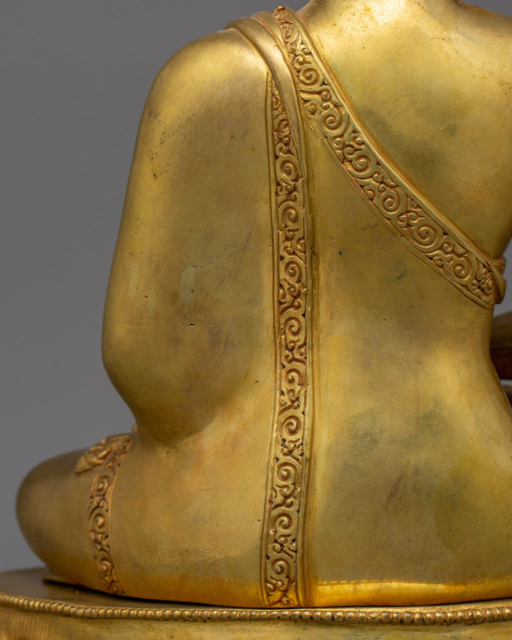 Amitabha is shown in a tranquil sitting stance, holding an alms bowl in his lap to symbolizing renunciation and the simplicity of the enlightened life. His peaceful countenance represents the knowledge and compassion he bestows on individuals seeking rebirth in his Pure Land; Amitabha's dedication to assisting all creatures in achieving spiritual awareness and freedom is demonstrated by this gesture.
