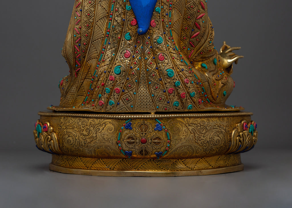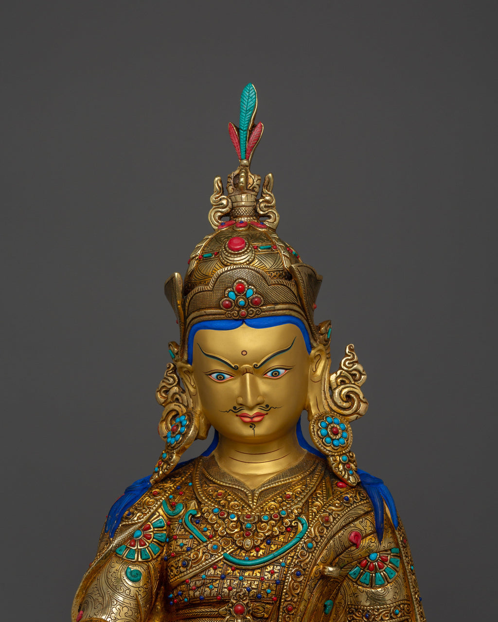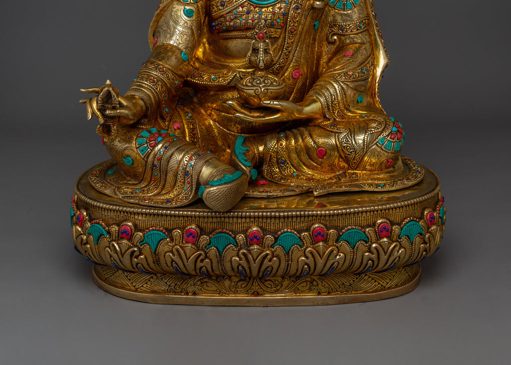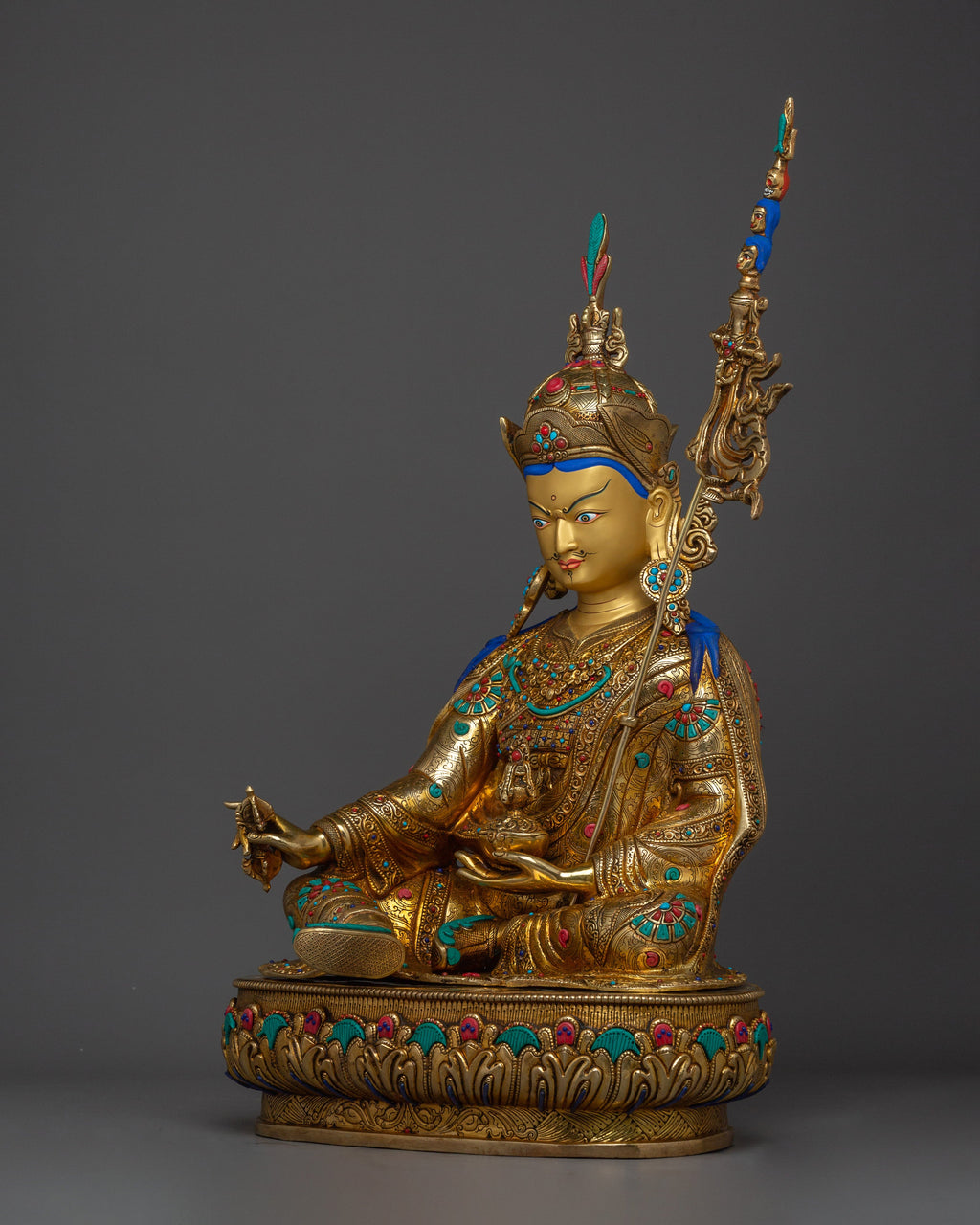 Guru Rinpoche, also known as Padmasambhava, is a highly respected person in Vajrayana Buddhism. He is known as the Second Buddha and is revered for his profound teachings and spiritual impact. His link to the Lotus-Born lineage represents purity and divine birth. This statue captures the essence of his teachings, serving as a focal point for both spiritual devotion and artistic adoration.