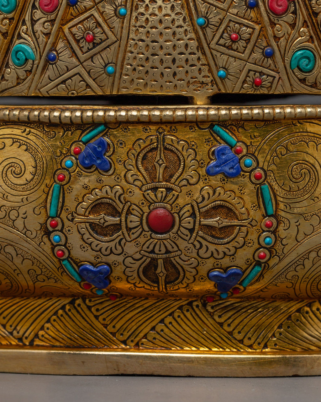 This stunning Nepalese sculpture of Guru RInpoche stands 23.2" in height and features a 13.4" base. It is crafted from triple-layer 24K gold-gilded copper with intricate gold and acrylic paintings with deeply engraved carvings. Adorned with gemstones, this piece pays homage to Guru Rinpoche, the Buddha of the Vajrayana—a unique and exquisite addition, perfect for art collectors and spiritual enthusiasts.