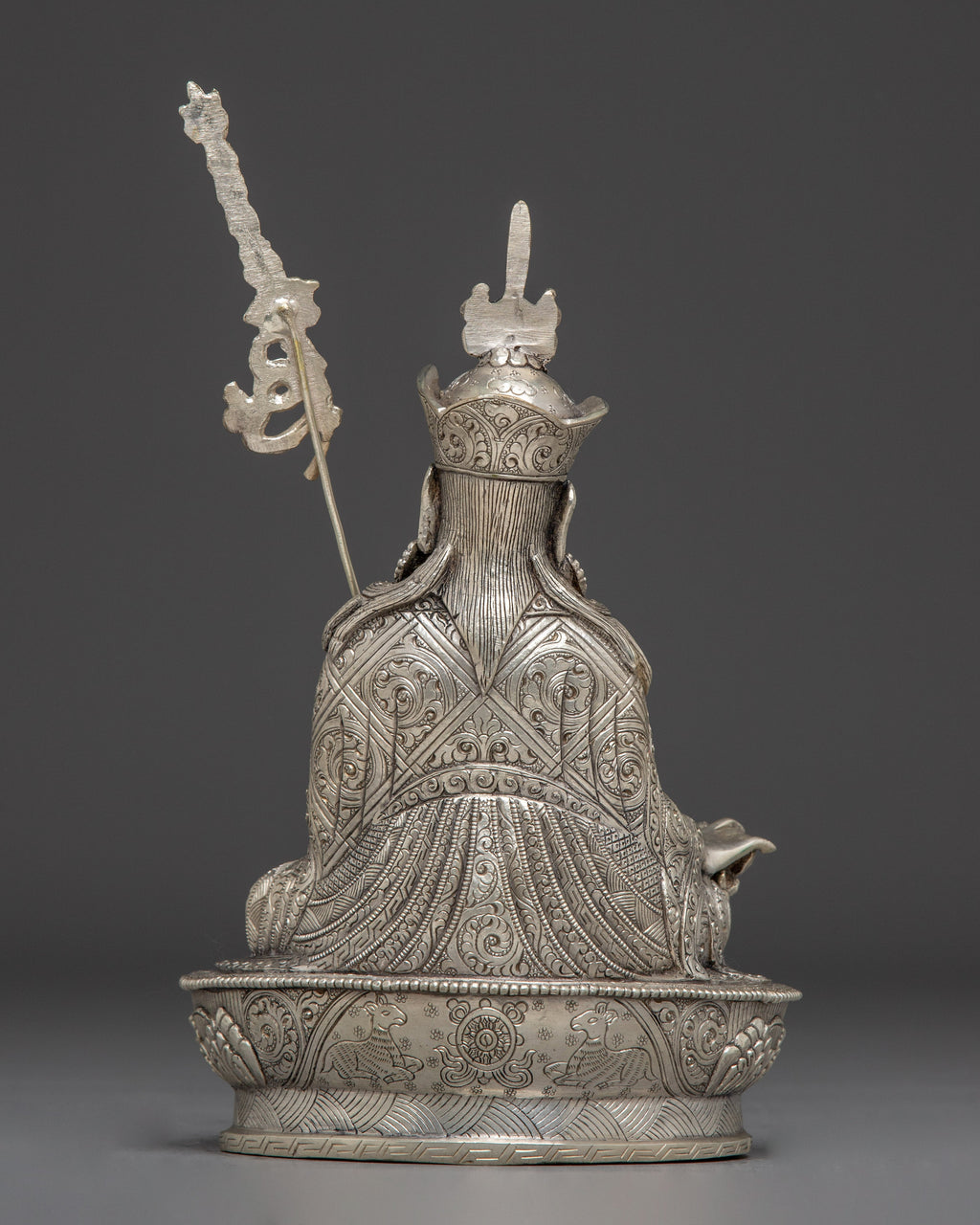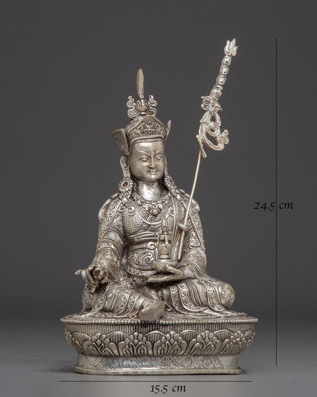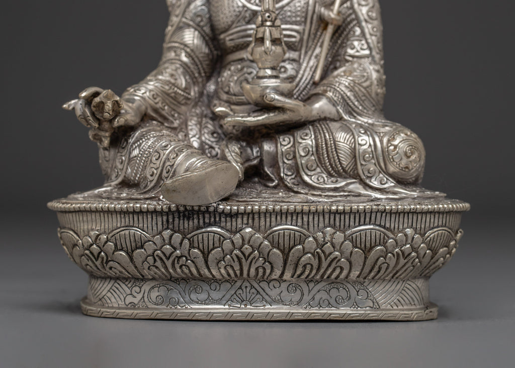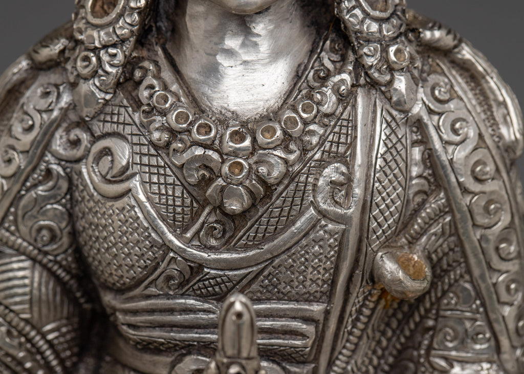 The Nepalese Spiritual Statue of Guru Rinpoche stands at 9.6”/24.5cm in height with a base width of 6.1”/15.5cm. It weighs 1.45 kg and is crafted from a copper body and is silver-plated. Created by expert Nepalese artisans, it represents Himalayan Buddhism's holy traditions, making it an appealing addition to altars, meditation places, or sacred collections.