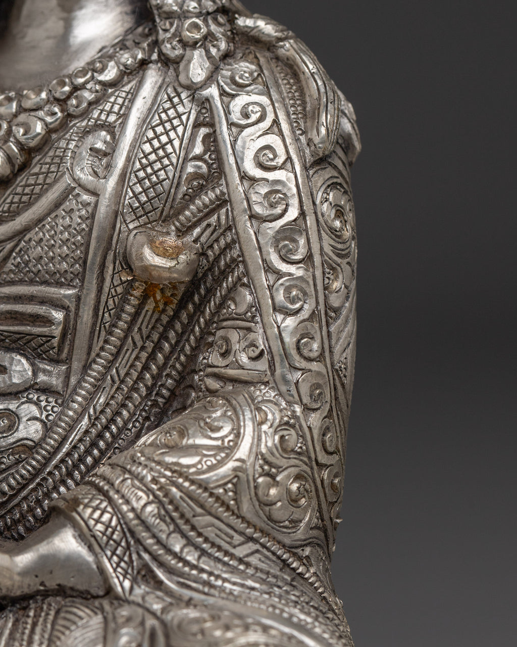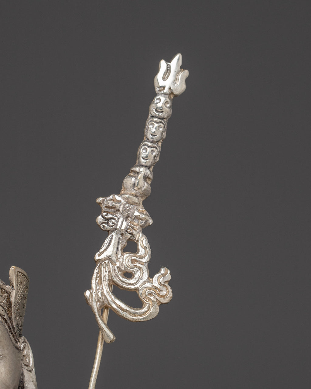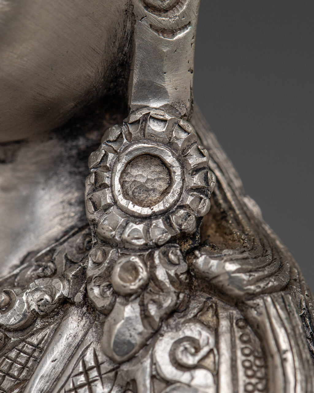 The Nepalese Spiritual Statue of Guru Rinpoche stands at 9.6”/24.5cm in height with a base width of 6.1”/15.5cm. It weighs 1.45 kg and is crafted from a copper body and is silver-plated. Created by expert Nepalese artisans, it represents Himalayan Buddhism's holy traditions, making it an appealing addition to altars, meditation places, or sacred collections.