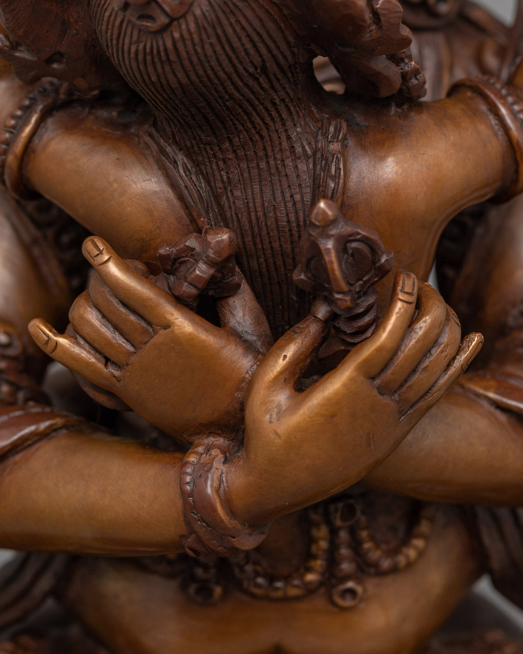 Vajradhara, the primordial Buddha in Vajrayana Buddhism, is depicted in union with his consort, symbolizing the inseparable nature of wisdom and compassion. In some representations, he holds two vajras, signifying the supreme and unshakable power of enlightenment and the dual aspects of method and wisdom. His embrace with the consort, typically in yab-yum (father-mother) posture, embodies the dynamic interplay of bliss and emptiness, illustrating the transcendence of duality. This depiction serves as teaching, emphasizing the integration of wisdom and skillful means necessary for attaining Buddhahood.