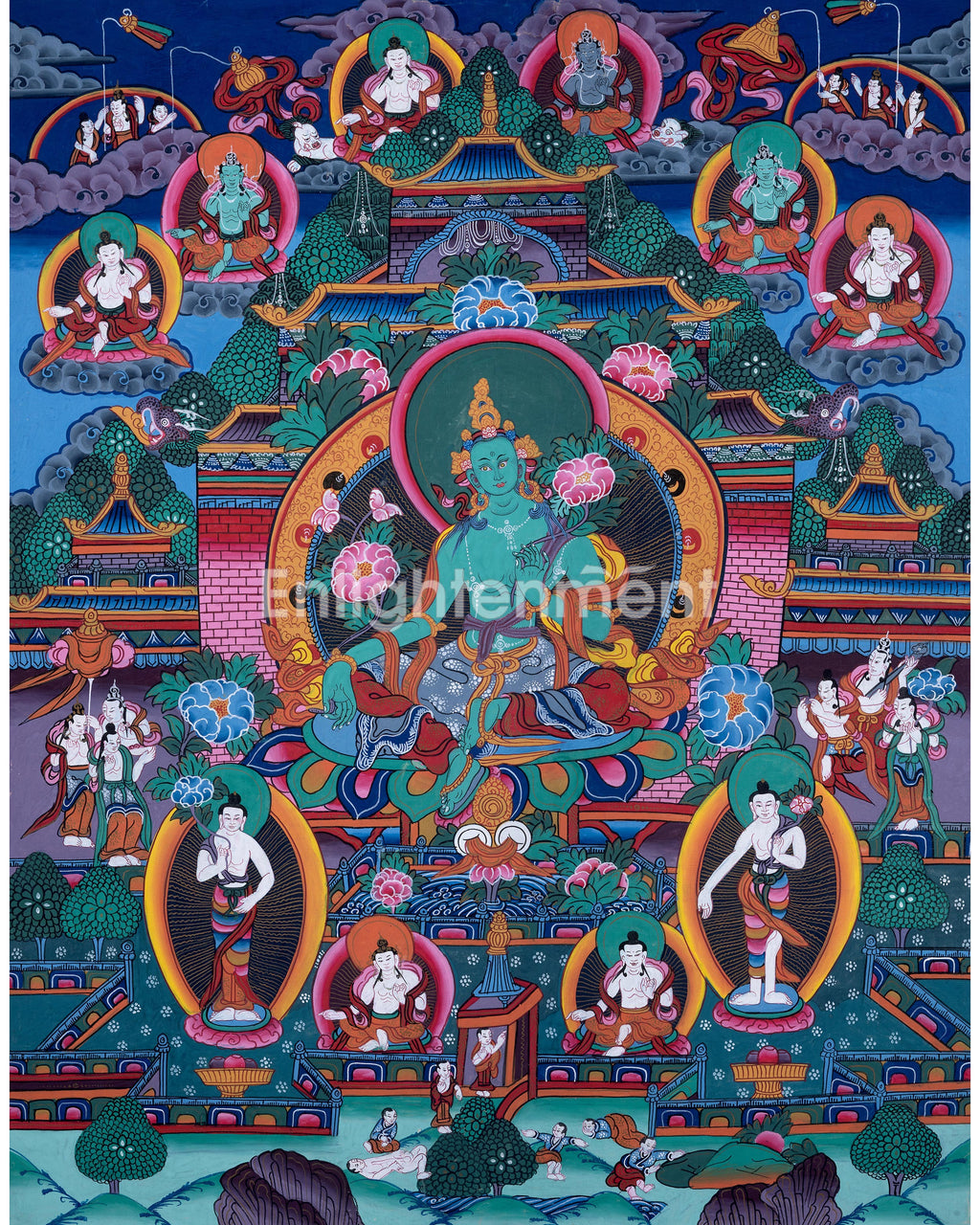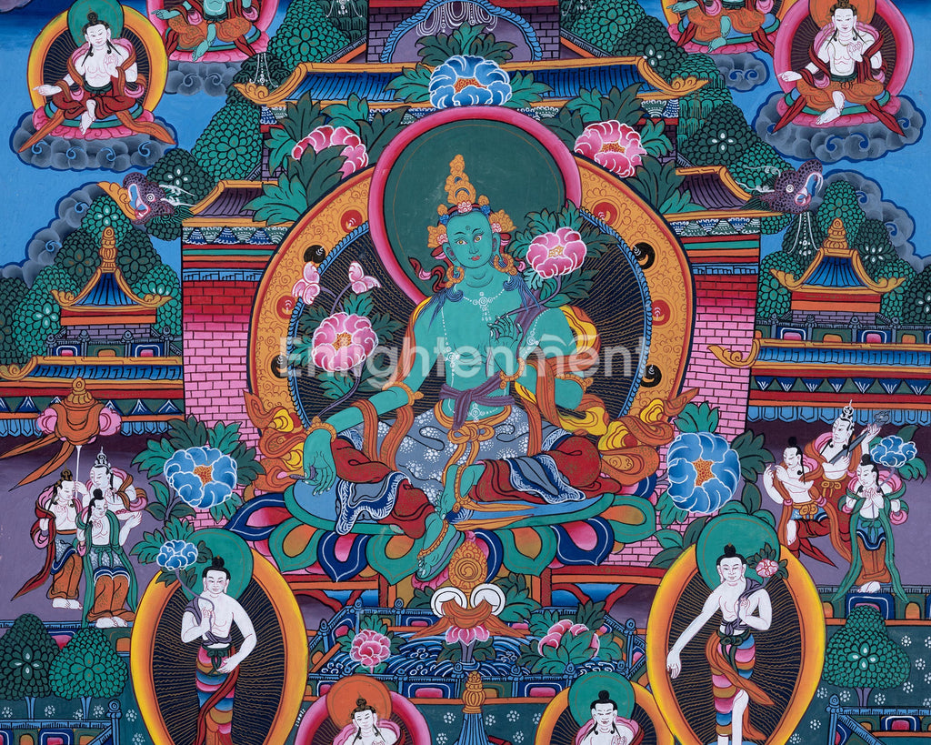 In this stunning thangka, Green Tara is depicted with serene grace, seated upon a radiant lotus throne. Her posture is one of calm readiness, embodying her role as the protector and savior of those in need. She holds a lotus flower in both hands, symbolizing purity, and her right hand gestures in offering and protection. The background is a harmonious blend of vibrant landscapes, featuring lush greenery, colorful flowers, and soft clouds that reflect her peaceful and healing nature. The deep, rich colors, combined with the delicate gold detailing, enhance her radiant presence, making this Green Tara Thangka a powerful and beautiful addition to your traditional wall decor collection.