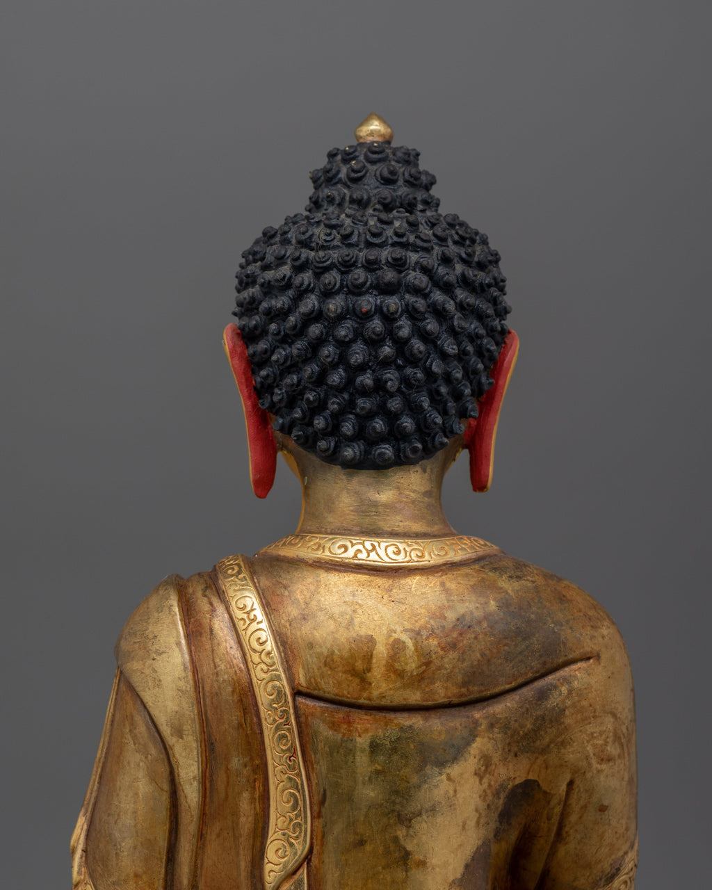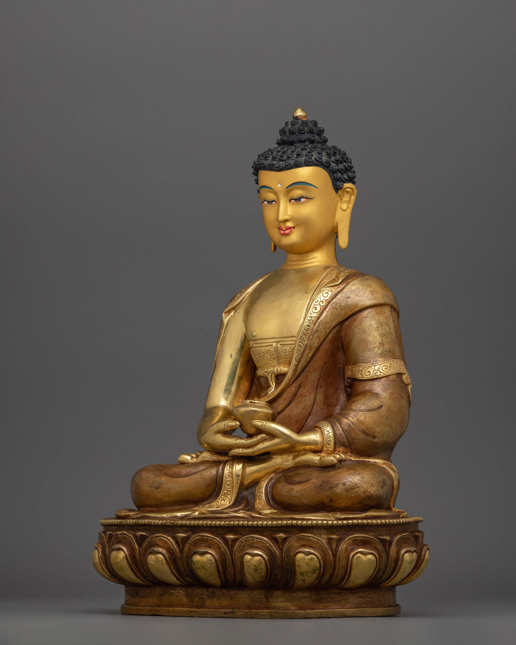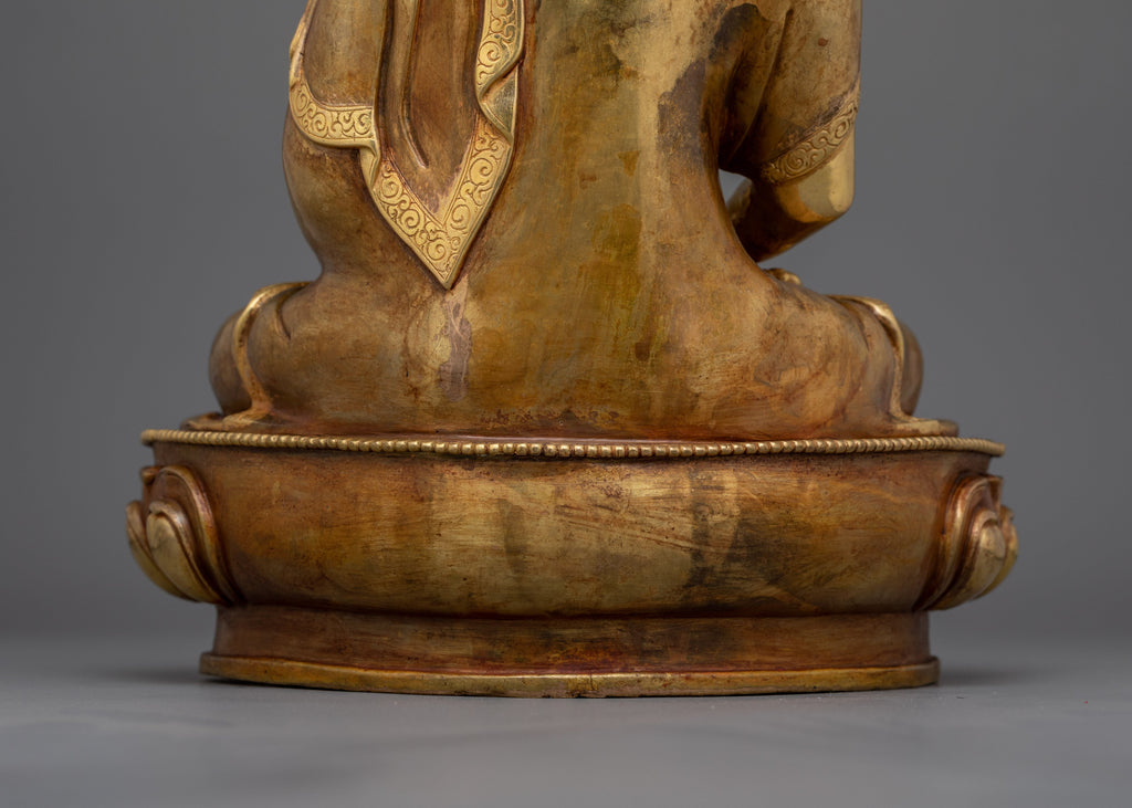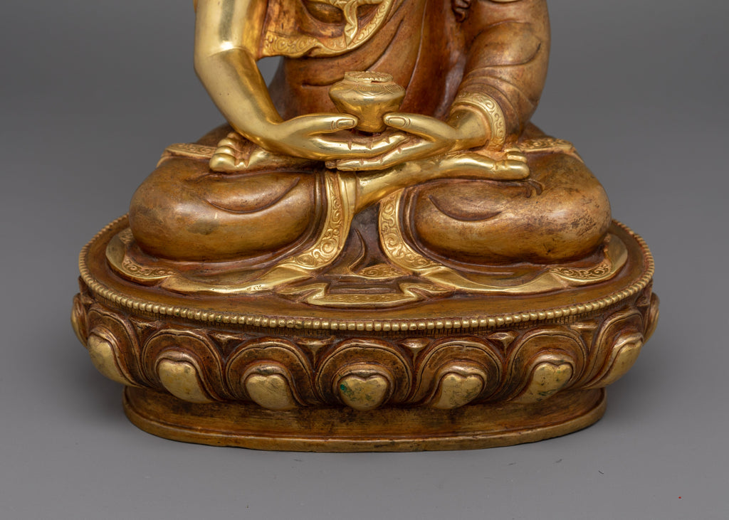 This statue was handcrafted in Nepal from oxidized copper and embellished with acrylic and gold paintings and 24K gold gilding. Amitabha is shown holding a sacred alms bowl while sitting in a meditative position, signifying unending wisdom and compassion. This holy work of art creates a peaceful atmosphere and is a potent reminder of enlightenment and infinite peace.