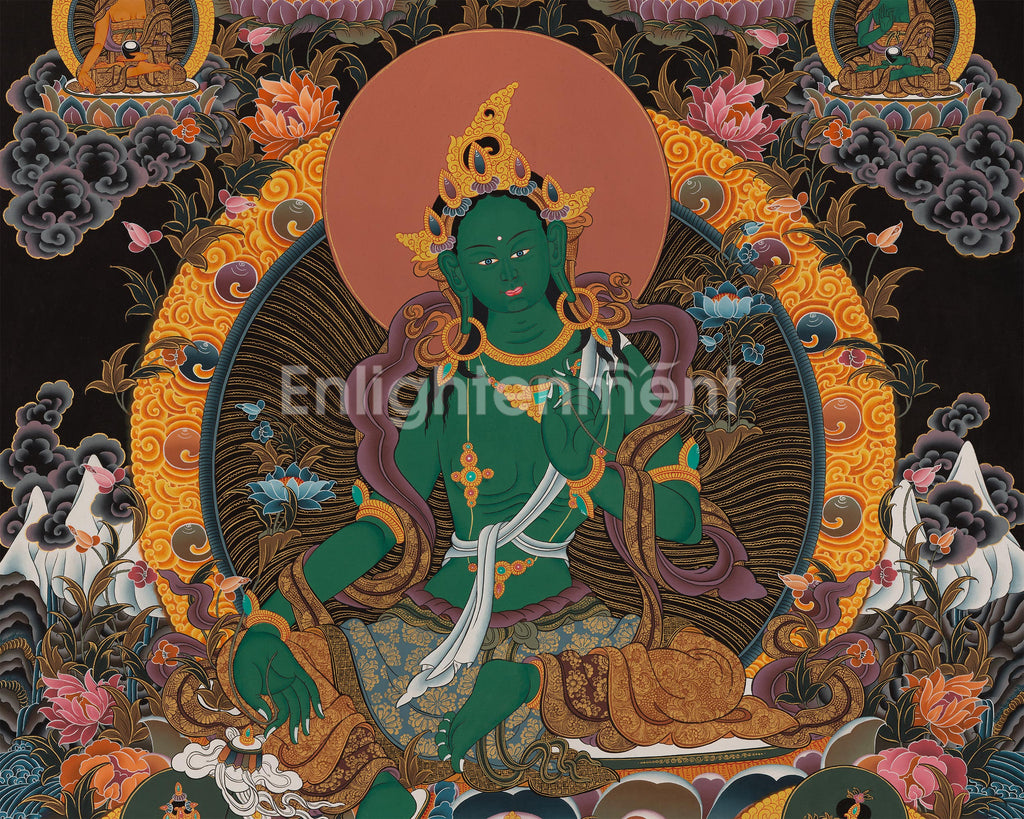 36 Inch Original Green Tara Thangka | Healing Goddess with Saraswati and the Five Dhyani Buddhas