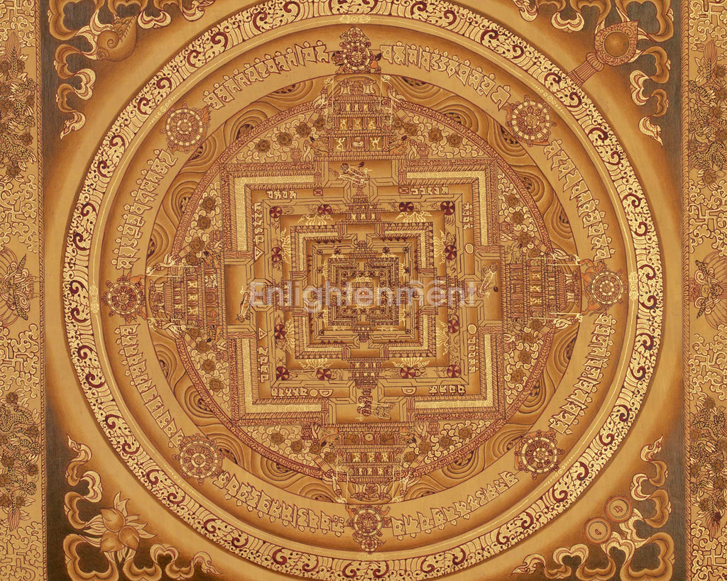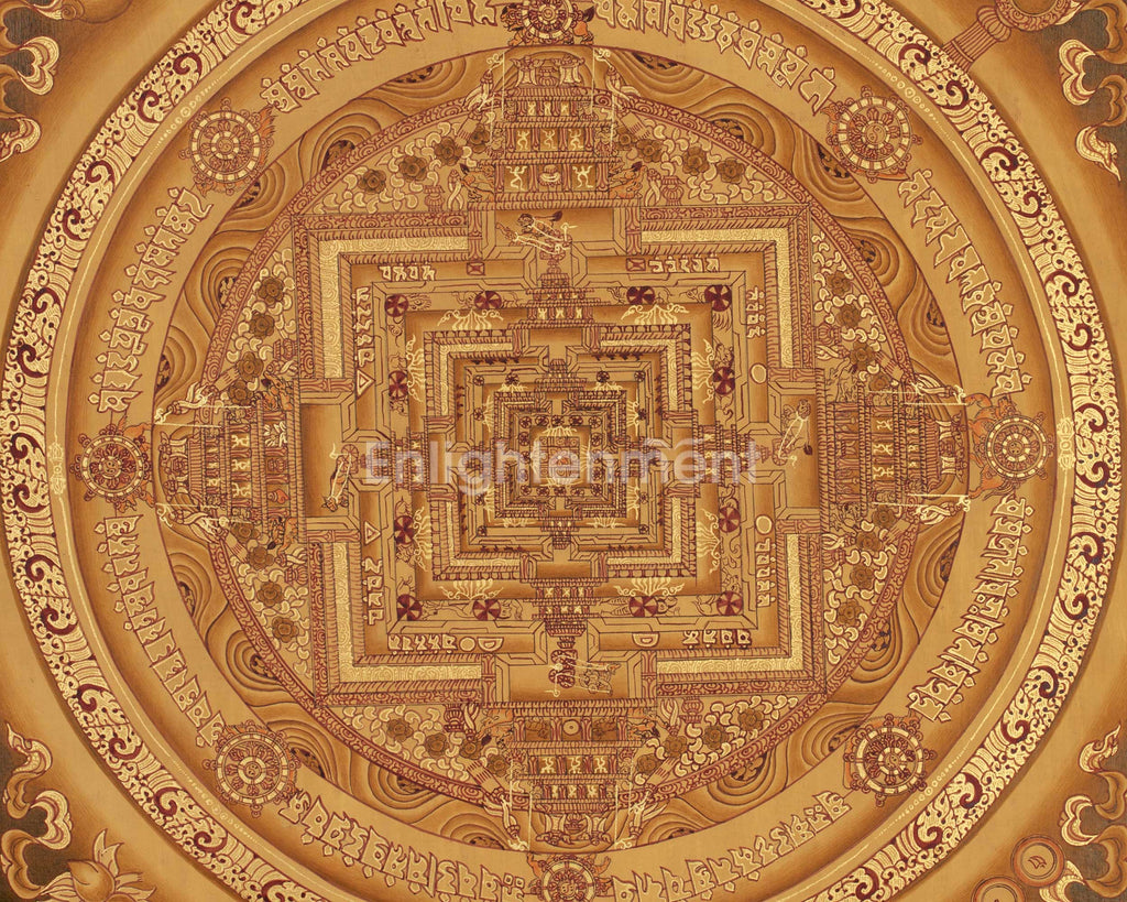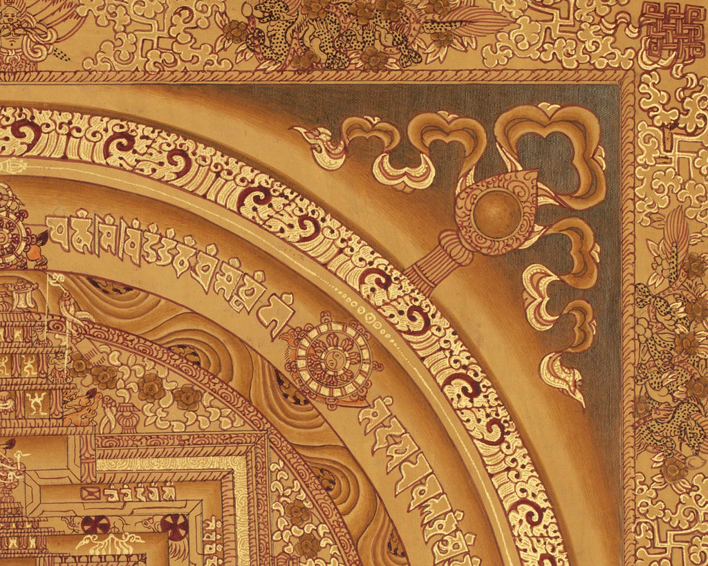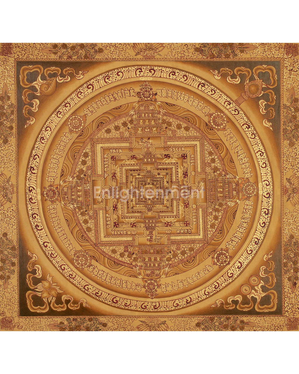 The original hand-painted Mandala Thangka captivates at first glance with its radiant symmetry and sacred precision. Hand-painted on premium cotton canvas, this thangka features rich acrylic colors layered with gold, creating a luminous surface that reflects light and intention. The careful application of gold highlights enhances depth and geometry, symbolizing purity, abundance, and enlightened awareness. Painted by a skilled Nepali artist in the traditional style, the materials themselves elevate this mandala from artwork to a powerful spiritual instrument, designed to support meditation, focus, and inner harmony.