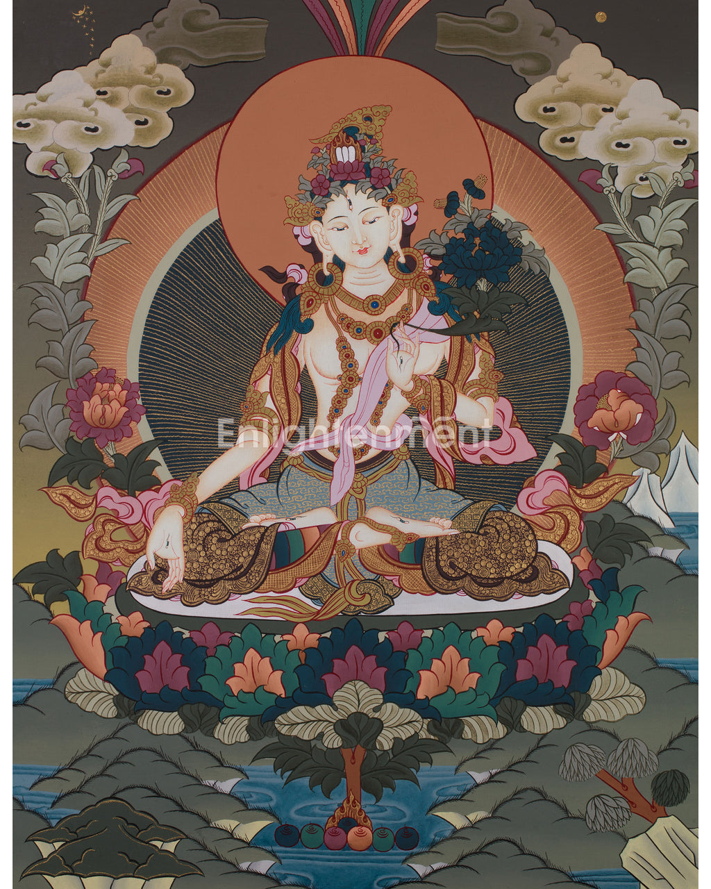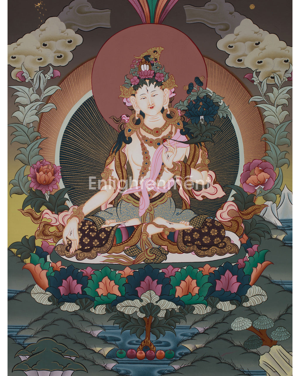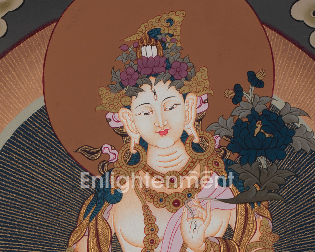 In this thangka, White Tara, the goddess of compassion and longevity, is depicted with serene grace, seated on a lotus throne with a posture of poised tranquility. She holds a lotus flower in her right hand, symbolizing purity and spiritual awakening, while her left hand rests in a gesture of blessing and protection. The artist has intricately painted White Tara’s figure with delicate detail—her golden crown adorned with jewels, flowing robes, and the vibrant lotus petals beneath her—enhanced by the luminous effect of 24K gold. Surrounding her are gentle clouds and lush foliage, creating a peaceful and healing environment. The entire composition reflects Tara’s nurturing presence, offering protection and blessings to all who seek her help.
