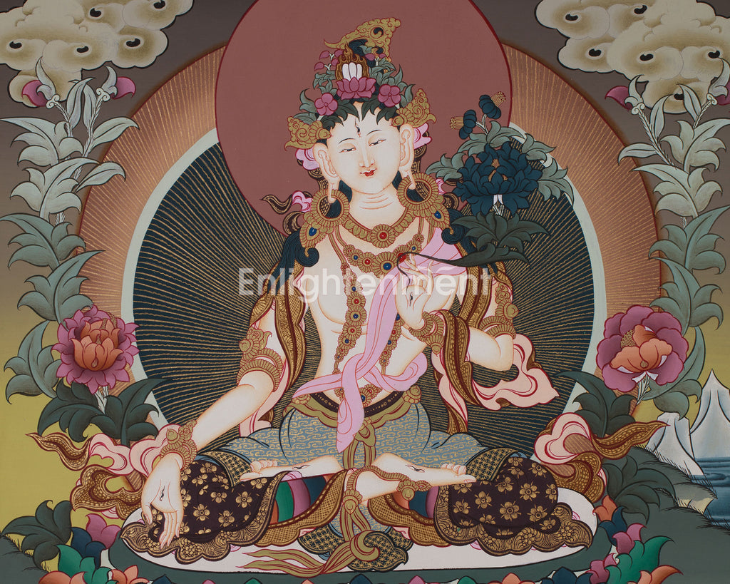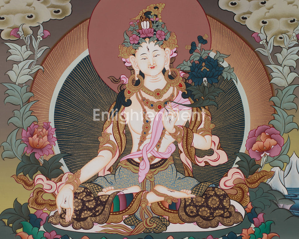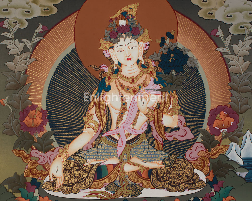 Experience the divine presence of the original hand-painted White Tara Thangka, meticulously created with acrylic colors and authentic 24K gold on cotton canvas. This traditional-style thangka, painted by a talented Nepali artist, captures the heart of Tibetan spiritual artistry. The precise application of 24K gold enhances White Tara's sacred allure, imparting a radiant glow to this exquisite piece. Each brushstroke vividly brings to life the purity and compassion of White Tara, making this thangka a prized addition to any sacred space.