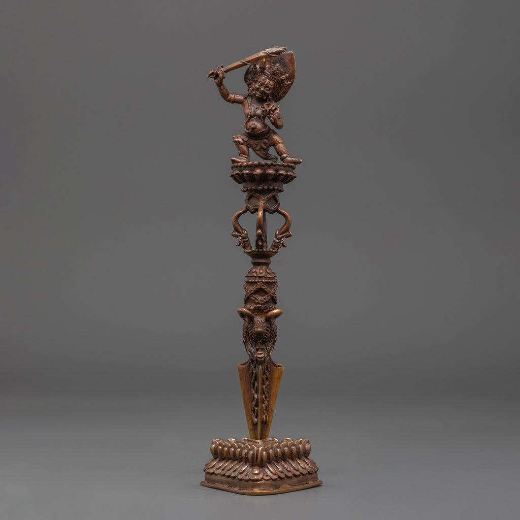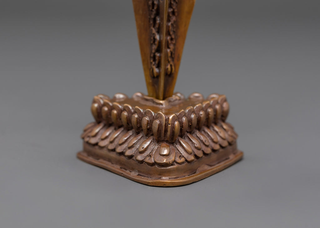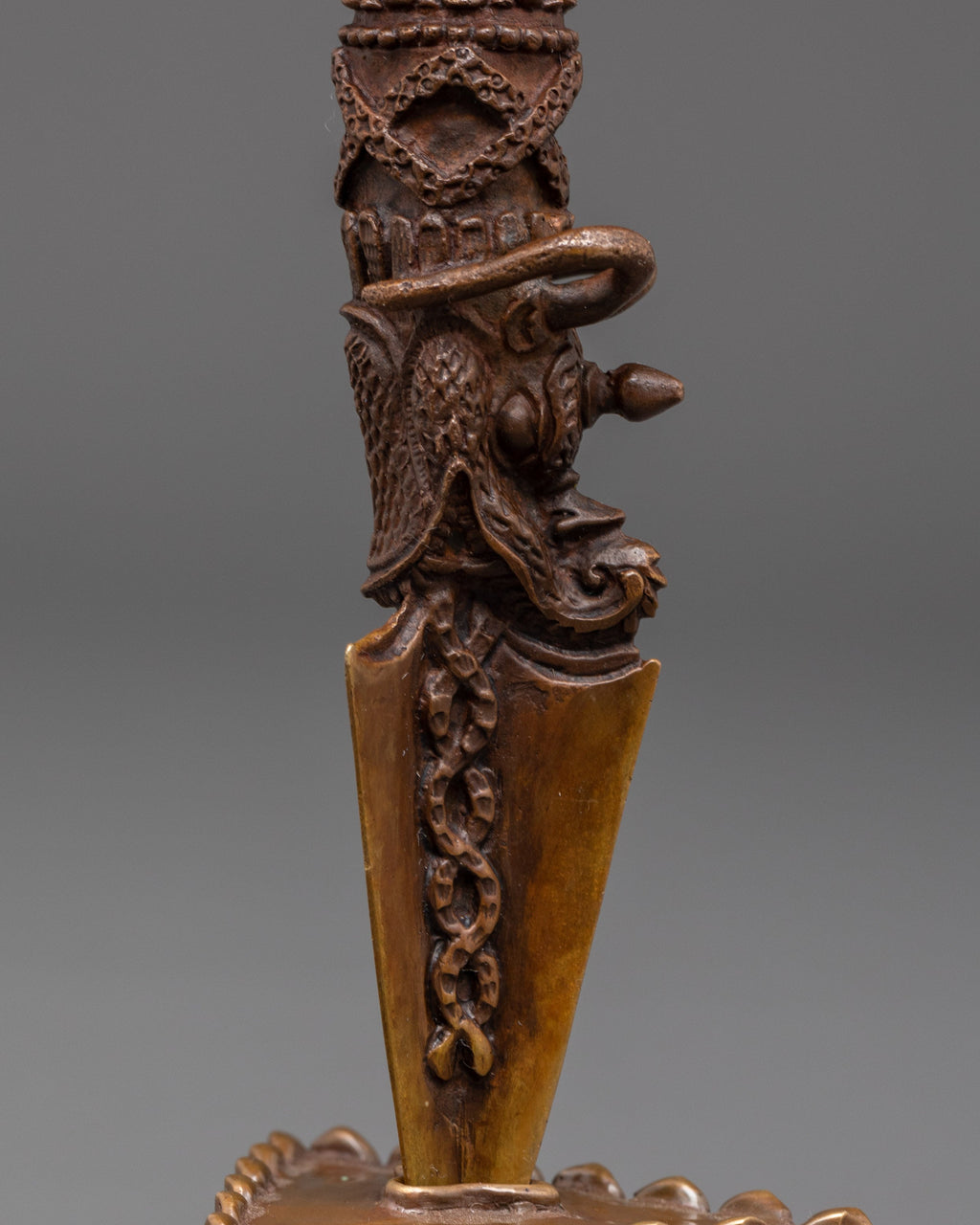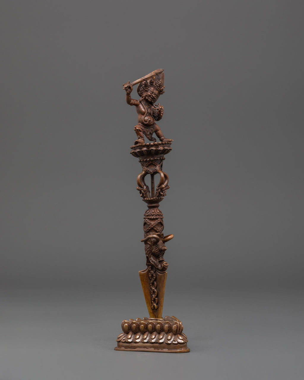 Expertly detailed with symbolic motifs, this oxidized Phurba features a three-sided blade that represents the overcoming of ignorance, desire, and hatred, the root causes of suffering in Buddhism. The oxidized copper not only enhances its visual depth but also symbolizes age-old tradition and spiritual endurance. This powerful ritual artifact is ideal for placement on an altar, within a meditation room, or as part of a sacred Buddhist collection.