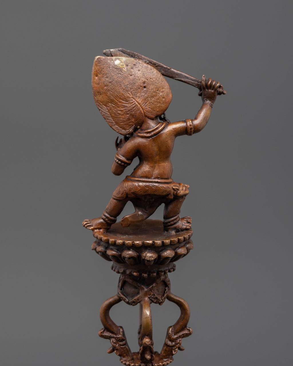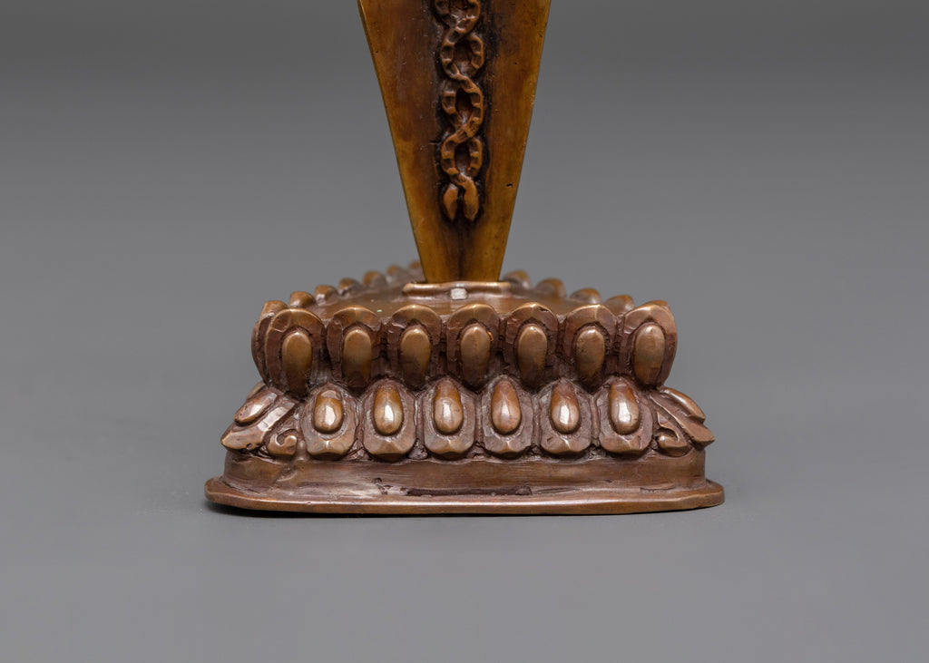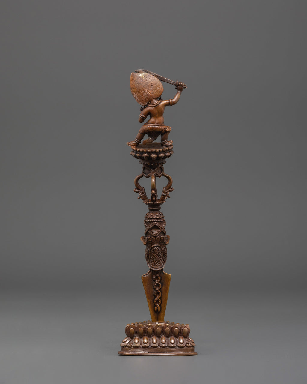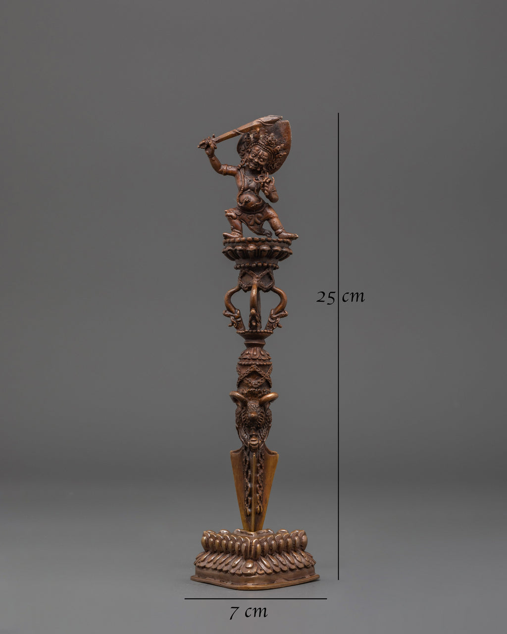 Expertly detailed with symbolic motifs, this oxidized Phurba features a three-sided blade that represents the overcoming of ignorance, desire, and hatred, the root causes of suffering in Buddhism. The oxidized copper not only enhances its visual depth but also symbolizes age-old tradition and spiritual endurance. This powerful ritual artifact is ideal for placement on an altar, within a meditation room, or as part of a sacred Buddhist collection.