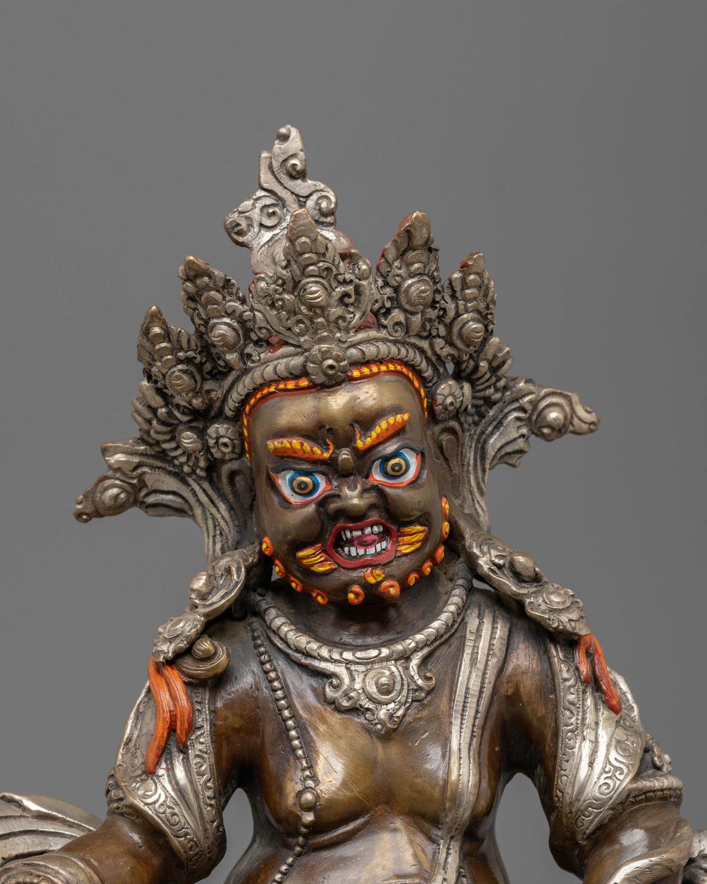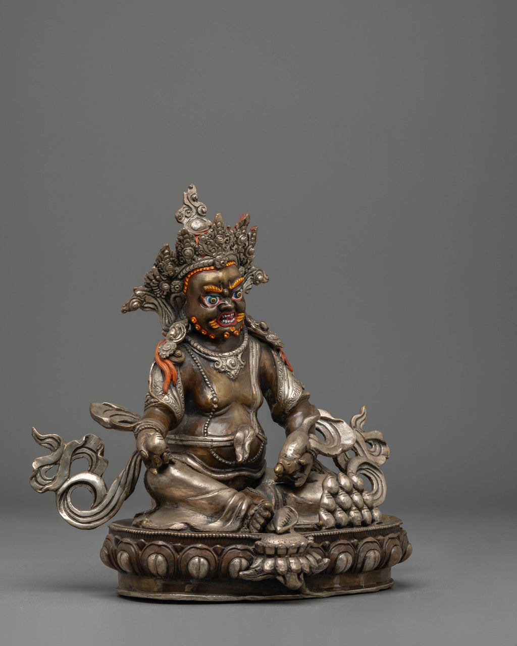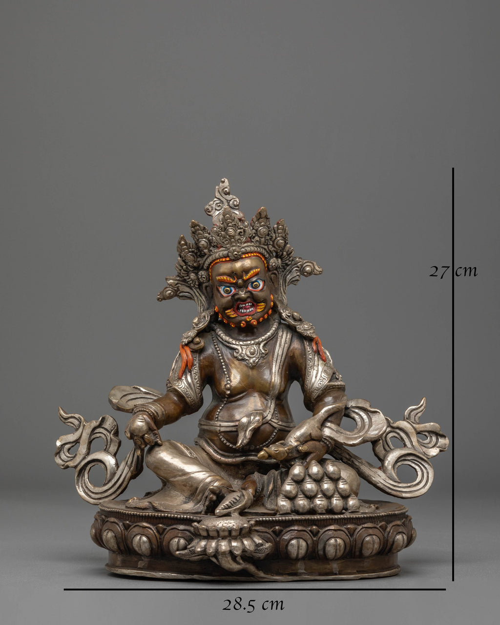 This Oxidized Copper Dzambhala Sculpture is a powerful representation of the Tibetan wealth deity Dzambhala, revered for bringing prosperity, abundance, and protection from financial obstacles. Standing 27cm tall and 28.5cm wide, this substantial sculpture is crafted from an oxidized copper body, finished with refined silver plating and detailed acrylic color accents. Dzambhala, known as the compassionate guardian of wealth, is believed to assist practitioners in cultivating generosity, overcoming scarcity, and attracting stable and virtuous prosperity.