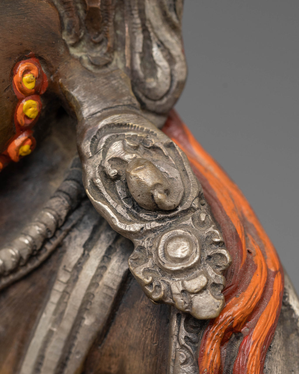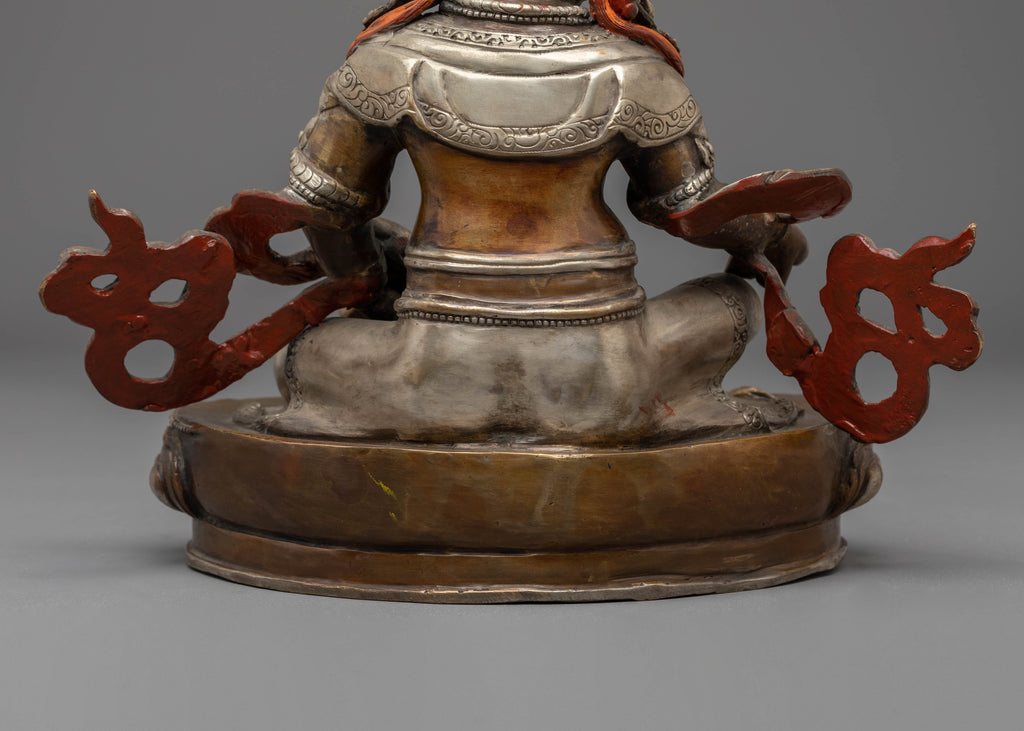 The intricate craftsmanship of this statue brings Dzambhala’s fierce yet benevolent form to life. His expressive face—enhanced with vivid acrylic pigments—radiates determination and protective energy. Seated in a royal posture on a lotus base, he holds traditional wealth-giving attributes such as the mongoose spouting precious jewels, symbolizing endless blessings and the removal of poverty. The oxidized copper finish adds depth, texture, and an antique aesthetic, while the silver plating highlights the divine patterns of his crown, ornaments, and flowing garments. Every swirl in the background clouds and every fold in his attire showcases exceptional artistic skill.