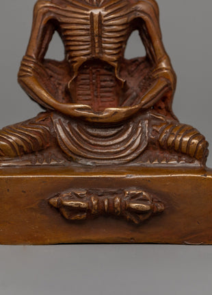 Handmade from oxidized copper, this stunning Fasting Buddha Statue exquisitely symbolizes spiritual dedication and the journey toward enlightenment. This artwork, which measures only 9.5 cm in height and 7 cm in breadth, is perfect for adorning your personal shrine or meditation area or as a thoughtful spiritual present. The Buddha is depicted in deep meditation in the statue's exquisite workmanship, signifying detachment, dedication, and ultimate inner serenity.
