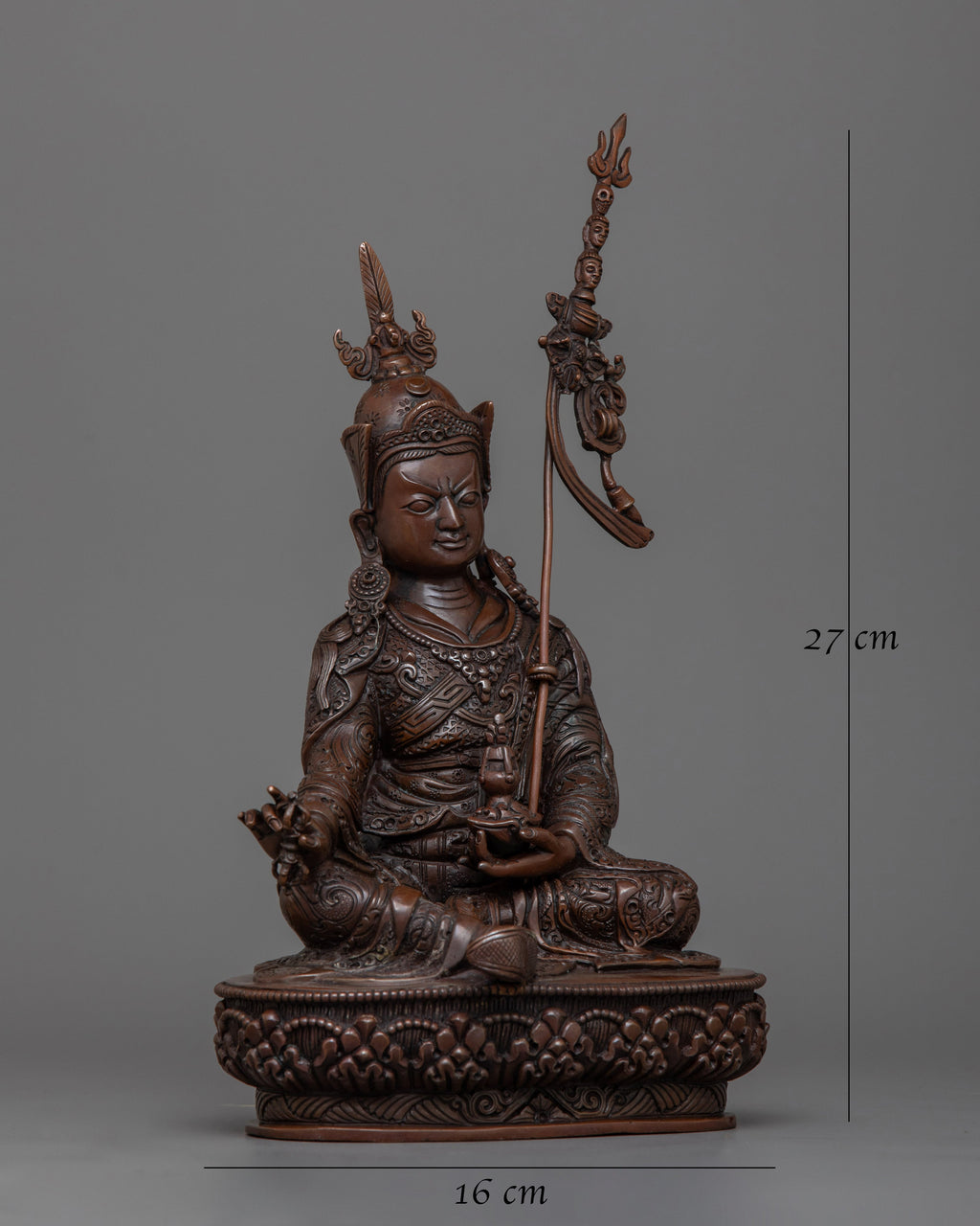 This 10.6-inch Guru Rinpoche Spiritual Artwork, handcrafted from oxidized copper, offers a timeless representation of the "Second Buddha" revered in Tibetan Buddhism. The statue’s rich oxidized finish creates a sacred ambiance, reflecting the spiritual depth of this iconic figure. Guru Rinpoche is depicted seated in a serene posture, holding a Vajra in his right hand, symbolizing unyielding spiritual power, and a vase in his left hand, representing boundless blessings. The detailed carving of his robes, ornaments, and serene expression speaks to the artistry of skilled Nepalese craftsmen.