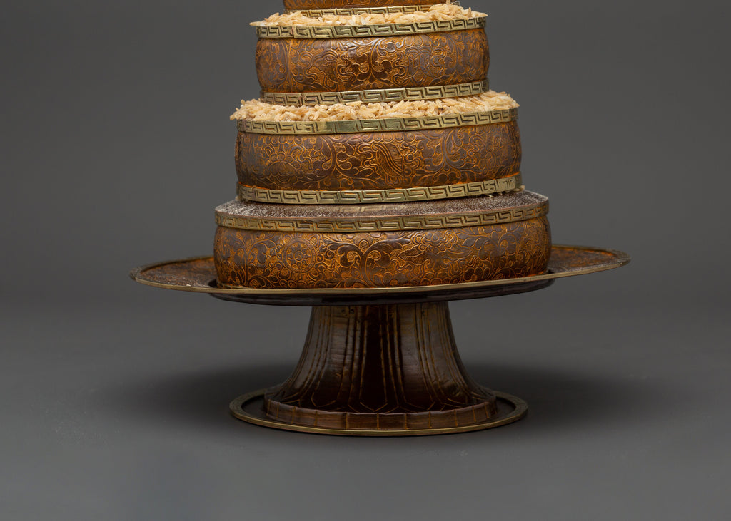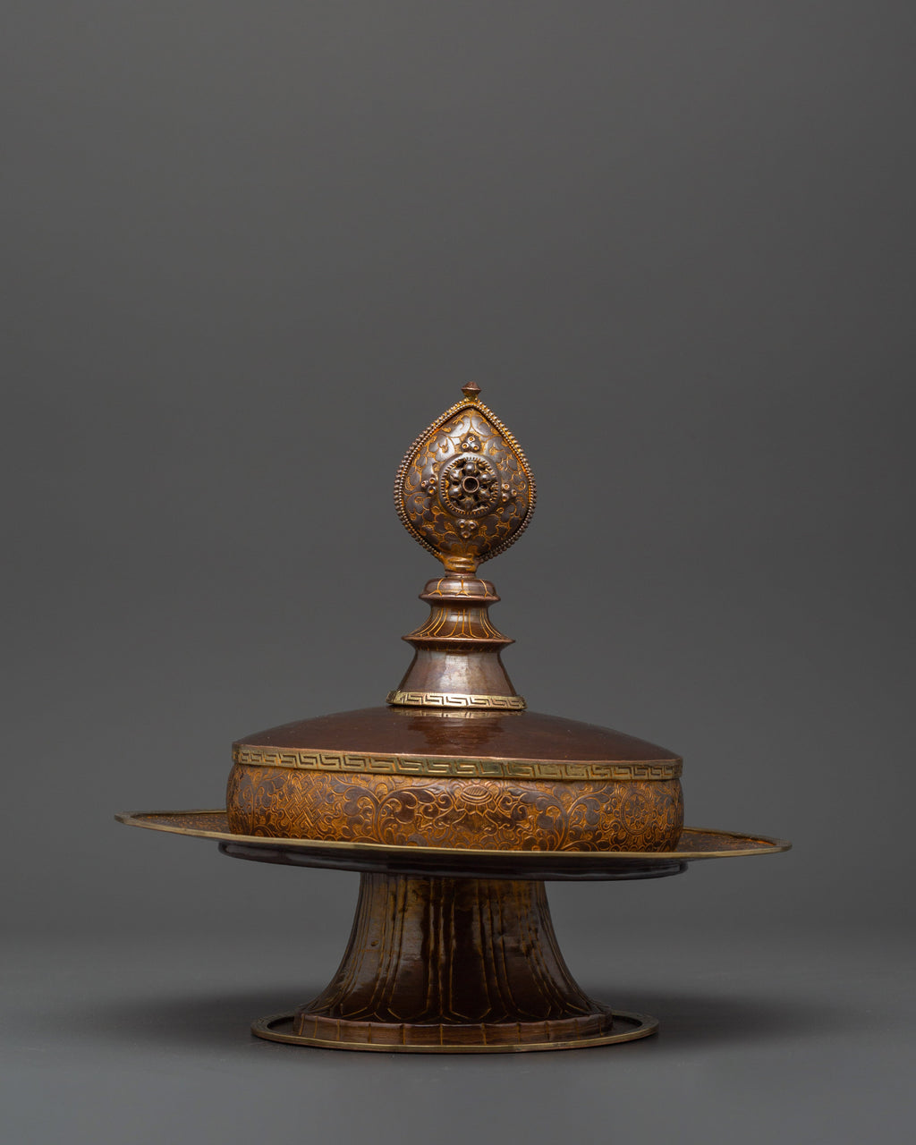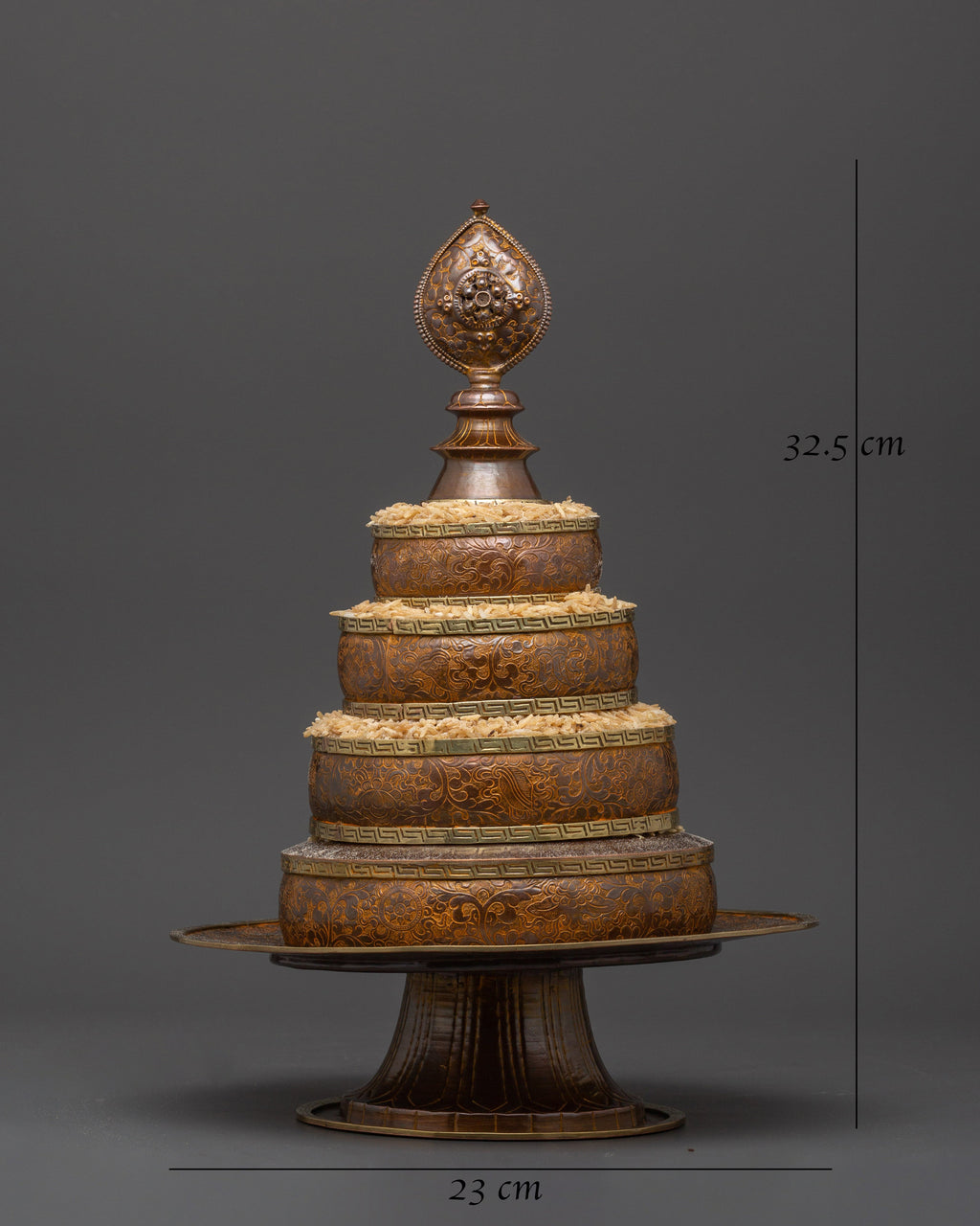 This handcrafted Oxidized Copper Mandala Offering Set, made of oxidized copper and enhanced with exquisite brass-lined borders, is designed to invoke an abundance and spiritual balance. This elegantly tiered mandala stands 32.5 cm tall and weighs 0.92 kg. It represents the universe and is used in Buddhist rituals to make sacrifices to enlightened beings. Each layer is carefully etched with classical motifs and geometric designs, finishing in a lotus-topped finial representing spiritual ascent.