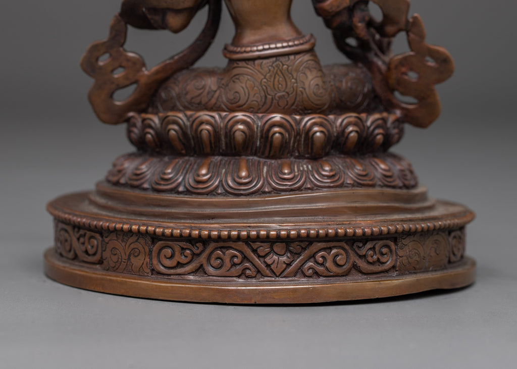 This Oxidized Copper Statue of Green Tara stands at 7.5”/19 cm in height with a 5.1”/13 cm wide base, weighing 0.90 kg. Expertly crafted from oxidized copper and adorned with detailed acrylic paintings, this piece reflects skilled craftsmanship and makes a graceful addition to personal altars, meditation spaces, or sacred collections.