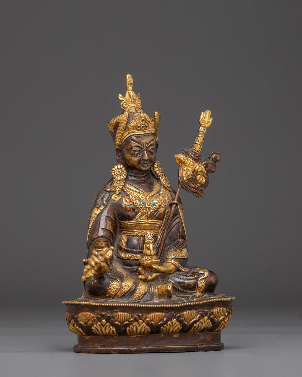 Guru Rinpoche's oxidized copper statue is 21cm in height and 13.5cm in width, and weighs 1.06kg. This statue, made of oxidized copper and embellished with gold plating and artificial turquoise stones, depicts Guru Rinpoche, also known as Padmasambhava, the famous master who introduced Buddhism to Tibet. Guru Rinpoche, known for his wisdom, compassion, and protective force, is a revered figure among spiritual practitioners seeking advice, blessings, and inspiration. This meticulously crafted statue makes a sacred centerpiece for meditation areas, altars, or personal shrines.