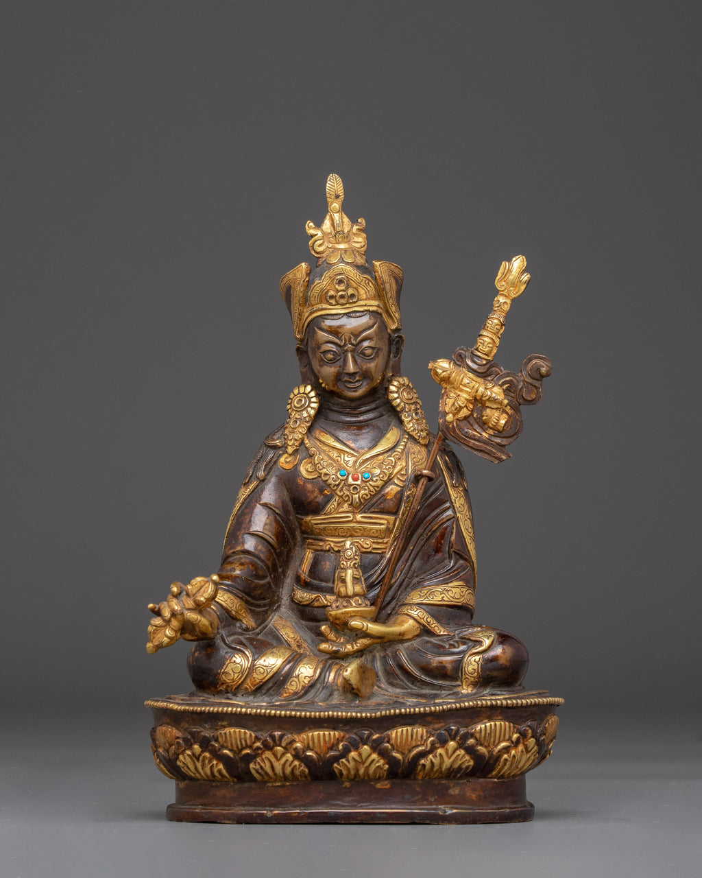 The Oxidized Copper Statue of Guru Rinpoche is ideal for meditation, rituals, or as a significant holy decoration. It brings blessings, guidance, and spiritual energy into your space. Placing this gold-plated figurine with turquoise accents on your altar or sacred area improves spiritual focus and serves as a strong reminder of Guru Rinpoche's protective and transformational presence. Include the Oxidized Copper Statue of Guru Rinpoche in your spiritual practice to get direction, protection, and inspiration from this respected Tibetan master.