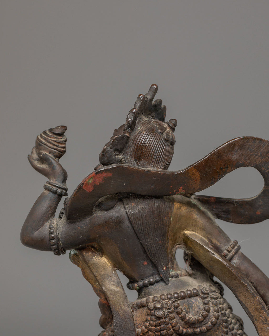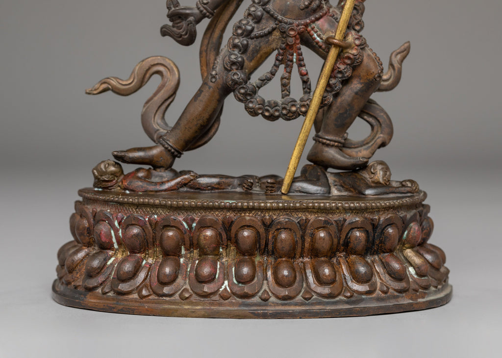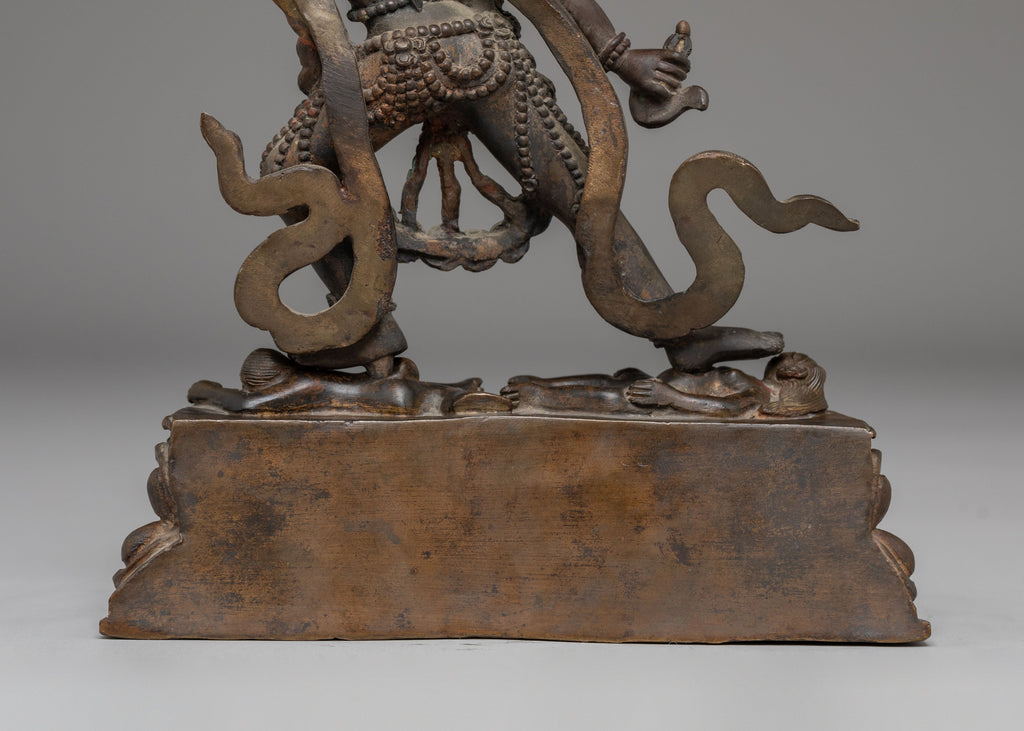 The statue is depicted in a dynamic posture, with one leg raised and a vajra (symbol of indestructible power) held in her hand. Vajrayogini’s fierce expression and multi-armed figure represent her role as the destroyer of ignorance and obstacles, empowering practitioners to break free from worldly attachments. The finely detailed jewelry, flowing robes, and fiery halo further emphasize her transformational energy, symbolizing the burning away of illusion and the illumination of wisdom. The oxidized copper surface adds a layer of ancient wisdom to the piece, making it not just a decorative object but a powerful spiritual tool.