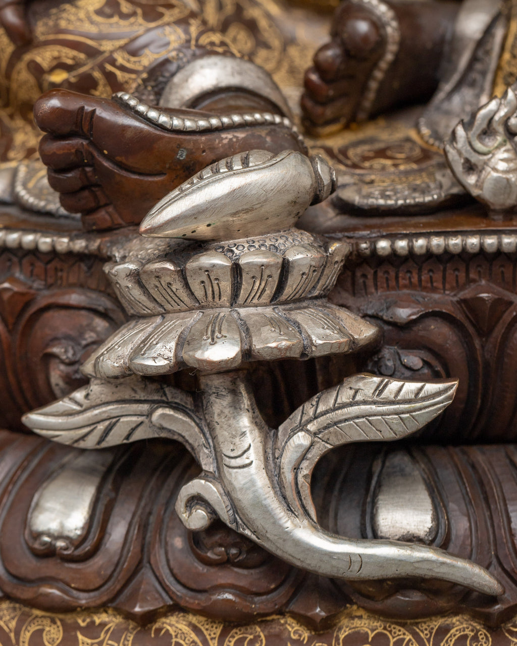 Explore the incredible artistry of the Oxidized Dzambhala Figurine, which has a base diameter of 10.6 inches and a majestic height of 12.2 inches. This sculpture, which is made of oxidized copper and lavishly plated in silver, radiates wealth and prosperity. The deftly placed acrylic and gold paintings by expert artisans accentuate the figurine's heavenly presence, and the accurate detailing symbolizes Dzambhala's guardian function in dispensing wealth and fortune.